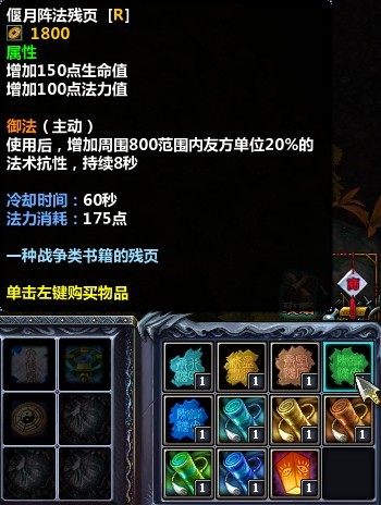 可选阵法 增强自身血量魔量,使用后增加范围魔法抗性,刘备如果还有格子,可以考虑出一个偃月阵法。 |