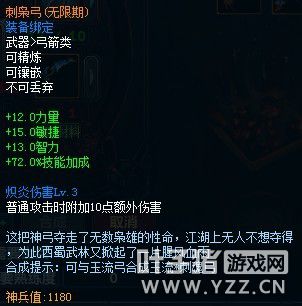 武器名称: 刺枭弓 神兵值:1180 获取途径:官方300元充值奖励获得 武器属性: 武器点评: 武器三围属性低,72%的技能加成不错,同时高达10点的额外伤害算是多少弥补了一部分缺点