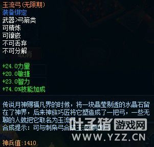 武器名称: 玉流弓 神兵值:1410 获取途径:第二章章节成就奖励,宝藏卡也可获得 武器属性: 武器点评: 三围属性加成不错,而且74%的技能加成非常不错,是性价比很高的武器,获取途径简单,推荐拥有。
