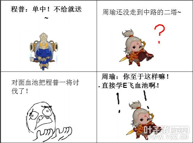 叶子猪梦三国交流群: “你在干嘛?”“看叶子猪梦三国专区呢!”“有什么好看的?”“暴走漫画梦三国!” 【叶子猪梦三国暴走漫画系列】火爆出炉了!想看更多有趣的关于梦三国的暴走漫画吗?那你就来叶子猪梦三国专区吧!爱竞技,更爱梦三国! 还记得曾经大家最爱玩的程普吗?还记得和好基友诸葛亮刷新双大的程普吗?还记得可以随便传送的程普吗?还记得你第一次玩程普的样子吗?以来来回忆回忆那些年一起二过的程普吧~~~ 那些年的程普:中单,不给就送~ 程普:单中!不给就送~ 周瑜还没走到中路的二塔~ 对面血池把程普一将讨伐了! 周瑜:你至于这样嘛!直接学E飞血池啊!