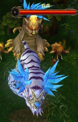 1、向前直冲,造成750点法术伤害。40秒冷却。 2、召唤一道月光对目标造成900点法术伤害,并眩晕2秒。 3、召唤数道月光,每道900点法术伤害,每个敌人最多受到2道月光(暴怒)。 在地图的上方,需要找基地右侧的传送使者传送至白虎殿。白虎在四圣兽中也有不小的威胁,它的技能伤害很高,如果你不幸被多个技能连续击中,那就危险咯,所以最好不让自己的血量太低。白虎被击杀后1分钟会刷新。 击杀后获得500金钱并掉落白虎徽记(可与其他3个圣兽徽记合成四象仙丹用以合成神器或直接服用增加30点全属性),随机掉落白虎召唤卷轴和精炼宝石。