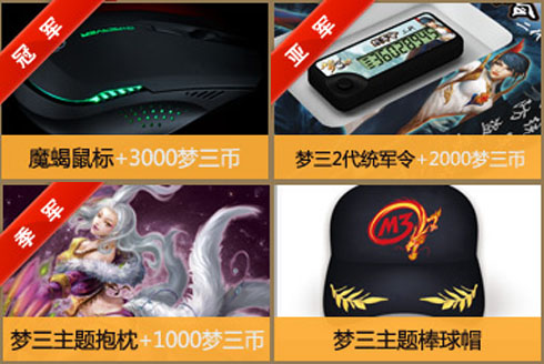 丰厚的奖品 《梦三国OL》一系列的线上、线下比赛不但挖掘出了大量的平民电竞明星,为大家提供了一个展示自我的舞台,更为广大玩家带来了超多的奖品和福利,本次的《梦三国OL》冬季联赛当然也不会例外。只要玩家参加本次冬季联赛,就可以获得梦三主题鼠标垫,每周前15名的选手则将获得梦三主题棒球帽一顶,而每周的周冠军更将获得魔蝎鼠标一个+3000梦三币,亚军将获得梦三二代统军令+2000梦三币,而季军将获得梦三主题抱枕+1000梦三币!奖励是不是让你很惊喜啊?还有更惊喜的呢!因为本次联赛每个城市都有四个比赛网吧,因此以上奖品每个城市都有4份哦!就是说,每个城市每周都将有四个冠亚军,想拿奖励实在太简单啦!