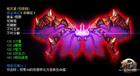 华胥幻梦羽 梦三国今年首个版本“金蛇狂舞”中推出的全新金色翅膀,也是目前梦三国合成系统可以合成出的最高级的翅膀。华胥幻梦羽的外型极其华丽,给人带来了一种强烈的梦幻感,配合上梦三气质美女蔡文姬更是绝配中的绝配。同时力量、敏捷、智力各30点的加成以及65点的移动速度加成,也让您有足够的资本笑傲副本,更别提她攻击时吸取3%的伤害化为自身生命值的嗜血狂魔效果和无视护甲及法术穿透效果了。绝对是你吸引眼球,激战副本的最佳伴侣,最重要的是它可是可以合成的哦~~亲! 噬灵翼 噬灵翼是梦三国不久前推出的幽冥噬灵召唤卡中推出的金色翅膀,这对沾满鲜血的魔翼一出现就受到了众多梦迷的追捧。而38点力量加成、28点敏捷、智力加成以及45点攻击力加成、60点移动速度加成的属性效果更是给力十足,2级嗜血狂魔(攻击时,吸取4%的伤害转化自身生命值)的效果更是令人无法直视。