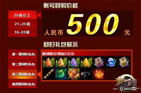回归送礼,领取连环回归礼包 如果你只是因为忙碌或是其它原因而许久未登陆梦三国,但你不想离开你最爱的梦三,那就赶紧来领取回归礼包吧!如果你的游戏等级<11级则可获得新手礼包,而游戏等级≥11级的则可选择获取凤舞九天礼包或者天命黄巾礼包。同时,当这些游戏账号在游戏内累计新增积分达到一定程度时,还可以领取下一重礼包,最多可以领取四重礼包!每一重礼包里都含有丰富的道具奖励,并且越高重的礼包奖励越丰厚! 天降馅饼,归人领取利息 天上掉馅饼这种事绝对是百年难得一遇,遇上了那果断要去捡啊!这不,在这次的老玩家回馈活动中,就有一个掉馅饼般的活动。只要你的账号领取了第一重回归礼包,官方就会根据你回归礼包发放大区的原有梦三币存量发放给你商城抵价卷!绝对的天上掉馅饼哦!(PS:根据你原有梦三币存量的不同,领取到的商城抵价卷的数量也不同,最高可以领取4张哦!)