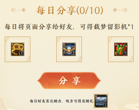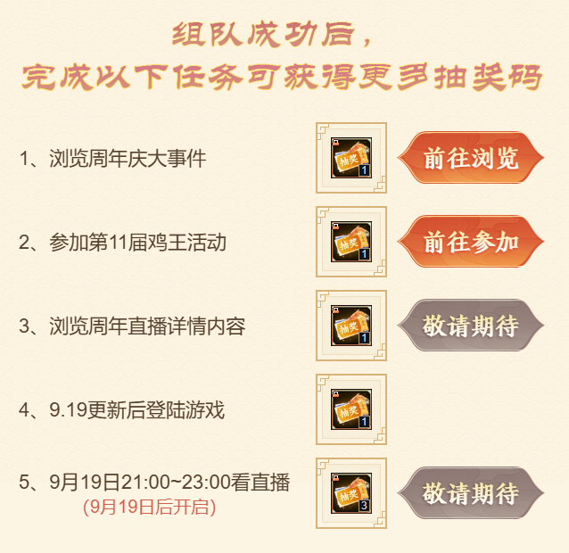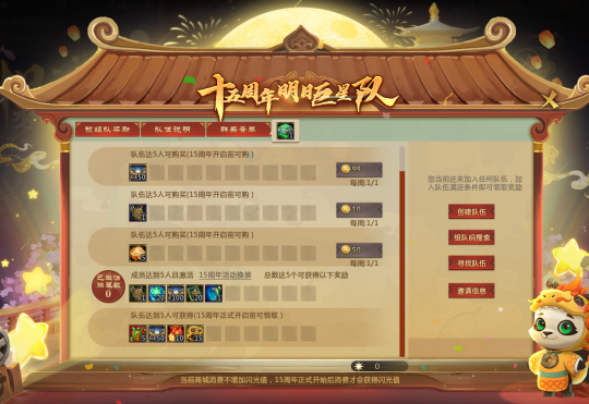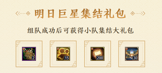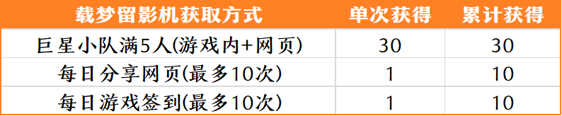 全服滴滴!十五周年的光影舞台正在搭建,年度大戏即将开机,梦梦发起招募令——加入明日巨星小队,做闪耀全场的主角,酬劳嘛自是少不了~ 9月4日-9月19日,组队成功就能白嫖周年代币闪光灯、士兵紫仙玉、百炼封神石、六级镶嵌卡、直播锦鲤抽奖码……免费奖励眼花缭乱,摇人打包都带走! 组队说明梦梦先来说说如何组队~老规矩,9月4日版本更新后,仙术师可在城镇右侧活动入口打开组队系统,选择创建巨星队伍或加入队伍。 游戏内组建小队后,就能通过搜索组队码,或网页分享(组队系统“群英荟萃”按钮可快速跳转网页)、快速入队等方式邀请他人入队。 打开邀请链接申请入队,经队长(队伍创建人)同意后成功入队,每支队伍同时最多有5名成员。 组队期间虽允许成员变动,但不是无限制的随意更换,离队会有相应惩罚,请大家选择最心仪且合适的小队加入,每支队伍最多可以加入8人次(队长计1次)~ PS:15周年庆正式开启前不计算可加人次与离队次数。 福运星途满5人小队状态下,成员们可在网页及游戏内解锁多重好礼、享受多项福利!01 明日巨星集结礼 集齐5人小队时,所有成员均可获得且仅获得1份集结大礼包,以及1张周年直播锦鲤抽奖码。 大礼包内有中级士兵卡*2、载梦留影机*15(可兑换收集礼盒)、闪光灯*200(15周年代币,用于兑换奖励)、高级防具珍材包*30。 明日巨星周礼包 满队后,成员每周可免费领取1份周礼包,内有七宝琉璃灯/空相宝莲自选*2、百炼封神石*5、高级防具珍材包*20、活跃自选包*5,最多领3周次。 直播锦鲤抽奖码 锦鲤抽奖码可参与9月19日晚的庆典夜直播抽奖,有机会带走年少换装、极仙系列、海量代币等。 同时,每拥有1个抽奖码将获赠1份心意礼,内有高级防具珍材包*5、珍宝自选珍材宝箱*1、活跃自选包*2。 除成功组成巨星小队外,仙术师还能通过浏览指定页面、游戏内签到等,免费获取更多锦鲤抽奖码及心意礼,大大增加中奖概率~ 游戏内组队奖励 活动期间仙术师完成下列任务,也能获得游戏内的奖励和限购福利—— 巨星小队满5人,可直接领取奖励:活跃自选包*5、高级防具珍材包*50、七宝琉璃灯/空相宝莲自选*10、载梦留影机*15。 小队满5人且解锁张昭、吕梦茹换装的数量达5个,可获得奖励:一百万个人士兵*1、百炼封神石*20、高级防具珍材包*100、十万士兵卷轴*20、成就助手升级尊享版*1。 满队状态下,还能享受超值特惠,每周以低价购买五行宠物精元、高级防具珍材包、十万个人士兵、神之防具打造书页。 载梦留影活动期间收集的载梦留影机,能用于游戏内兑换珍稀奖励。此外,仙术师也可以参与拼团团购,解锁额外道具及周年代币闪光灯。01 留影机收集礼盒 积攒35个载梦留影机,能在组队系统处兑换留影机收集礼盒,一次性领取藏龙紫仙玉*3000、六级镶嵌卡*1、四象仙丹*2、高级防具珍材包*80、十万士兵卷轴*20。 梦梦划重点——兑换所需的载梦留影机均可通过组队、签到、分享免费获得,具体如下表所列: 其中每日分享页面给好友,活动期间累计可得载梦留影机*10、高级防具珍材包*20、活跃自选包*10。 且每日好友首次助力,双方均可获得互助礼,每日通过邀请好友和首次助力最多能拿2份互助礼,可劲儿白嫖士兵! 穿梭古今梦*互助礼(7天) 每日游戏内签到可在网页领取签到礼,总计可得载梦留影机*10、藏龙紫仙玉*500、活跃自选包*10。 小队拼团特惠购 当小队人数≥2人时,小队成员可消耗15梦三币购买1次特惠礼包。 礼包内有闪光灯*300、十万个人士兵*1、征战印记*100、高级防具珍材包*10、两万士兵卷轴*20。 若当前小队全员购买特惠包(离队不计入),也可额外领取拼团礼:闪光灯*500、百炼封神石*10、高级防具珍材包*30、十万士兵卷轴*50。 当然啦,9月20日十五周年庆活动正式开启后,组队的仙术师还能通过累积闪光值,获得更为丰厚的游戏奖励!还等什么,小队搭子们速来~ [编辑:月光下完美]