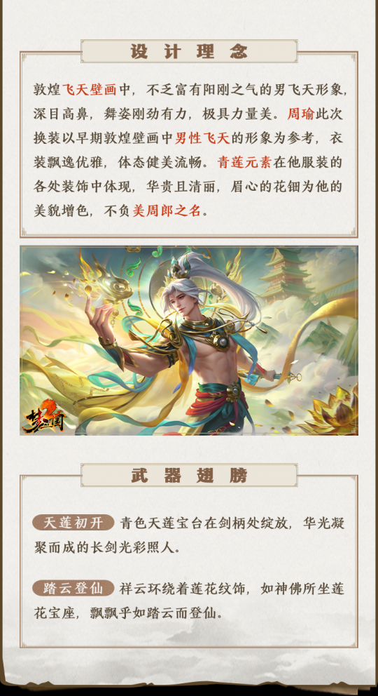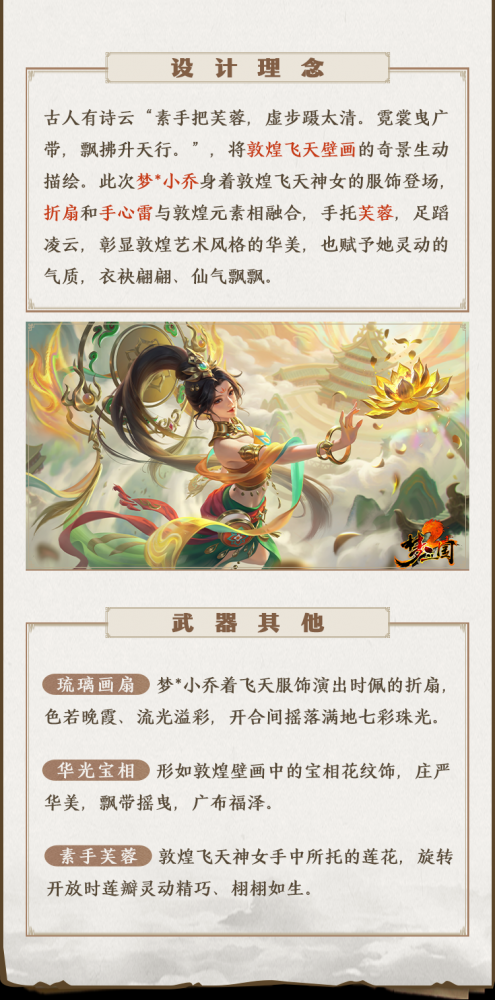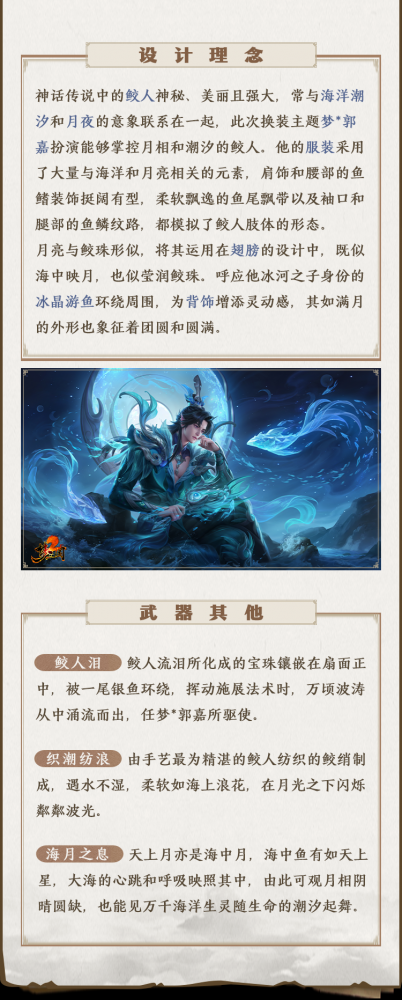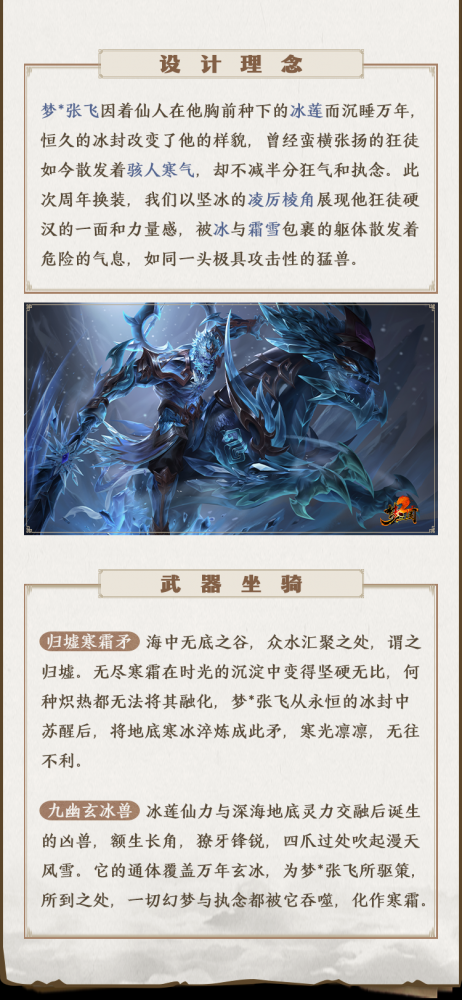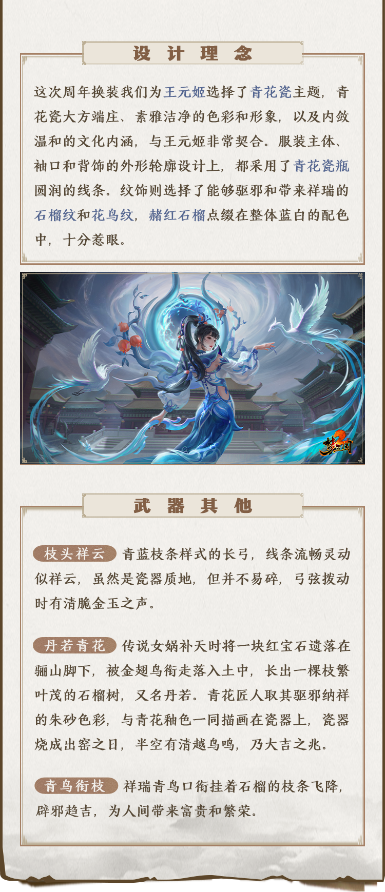 十五周年盛典火热筹备中,此刻造梦之城星光云集,华服锦衾熠熠生辉。横店“景区代言人”吕轲率先就位,以五种形象扛起开机大旗,全程记录每个时空奇景和众人的欢欣笑颜。 跟随吕轲的镜头,我们将看到:舞乐飞天动人心弦,千年神话传说上演,精怪志异频现,灵犀瑞兽延年……一幕幕好戏正待开场。 梦*张飞、梦*郭嘉、王元姬、典韦、梦*小乔、周瑜等纷纷换上特殊装扮,邀请诸位看官凝神入座,大饱眼福! 众水归处,深海之底,万丈深渊下深不见底的地下空洞内,玄冰四处蔓延,将整片空间映成幽深蓝色,任何生灵都无法在此极寒之地生存。生机凋敝的空洞正中,梦*张飞已沉睡万年,永不消融的坚冰在漫长时光中将他的身躯也同化。 命运的轮转从千万年后,一位仙人于梦*张飞胸前种下冰莲伊始,倒转交错的时空就此开始转动。冰莲赐予梦*张飞永生,也让他陷入沉睡,在数不尽的时光里,源源不断的寒冰之力从冰莲和他的身躯中涌出。 为使这异寒不危害人间,上仙将这片冰冻空间送往千万年前,一处炎热海岛深处的无人知晓之地,以此地极热与极寒互相制衡。 悔恨、执念、不甘,数十年人生中的得与失一遍又一遍地在梦中轮回上演,如同永远无法逃出的牢笼。从不散的疯狂执念里诞生的梦*张飞,在幻梦与冰莲的滋养下力量愈发强大,整片空间中的寒冰之力都逐渐为他所用。 直到能操纵时空的《太公兵法》现世,沉眠已久的寒冰之躯终于苏醒,挟万年执念,借兵法之力跨越时空,妄图改写幻梦中演练过不知多少次的场景,与所念之人再次相见。 众人协力平定时空混乱后,梦*张飞终于从他摄心的执念中清醒过来。既定的历史已无法改变,那索性就在此开启新章,若是能在那古今汇聚的梦之城里与故人相逢,看看千百年流转的时光,也倒不虚此行。 传说中南海之外有鲛人,水居如鱼,泣则出珠,月相盈亏变化时,鲛人会随潮汐的涨落在海中活动。关于他们法力和样貌的传闻,大多来自于夜航船上捕鱼人的描述。在渔民们口中,鲛人周身围绕着海蓝色的光芒,无数游鱼在他们周围聚拢又散开,有如海中仙境。 鲛人大多面容姣好且擅长法术,身为冰河之子的梦*郭嘉受邀扮演神鲛人一族的大祭司,为压轴的奇幻剧目献演。他不仅容貌昳丽非常,还手握能够操纵潮汐和月相的强大法器,论谁看了,也会惊呼见着神话里那奇迹了。 相传大祭司曾在朔望潮泛滥之时现身,只一人就挥退了汹涌潮水,数百民众幸免于难。潮水退去后,滩涂上留下星星点点细碎的微光,有好奇的渔民上前掬一捧沙细看,发现竟是一颗颗珠圆玉润的鲛人之泪。待渔民再抬头望向那抹海蓝身影最后出现的方向,梦*郭嘉只微微颔首后便拂袖离去,唯余一轮满月映照海面。 如在满月之夜游览园中,走过某片岸边,行于某座桥上,或是登上临水楼阁画舫,向着月光下的那片水域望去,或许能有幸得见那位传说中的鲛人。 曾经差点被邪魔蚩尤夺走躯体的典韦如今扮成了蚩尤的样貌,暗红兽角和凶神恶煞的兽首面具占去他大半张脸,远望去真如兽首人身的怪物。典韦手持两柄巨斧走过,兽蹄靴在地面踩出一串造型奇异的脚印,赤红身躯中似有炽热岩浆流动,张口呼喊咆哮便掀起一阵飞沙走石。 造型如此奇异的典韦走在城中,不免引人侧目,千万别被他粗犷凶狠的外表吓到,若想近距离观察他的装束,与他留影纪念,他并不会拒绝。 与他攀谈几句,或许还能有幸得到他独家放送的观影邀请函。届时城中最大的户外舞台上,蚩尤带领九黎族打响逐鹿之战的武打戏开场时,手持邀请函的贵客可落座前排,尽情享受亲临风云变幻的上古战场般的至尊体验。 王元姬初次抵达这座梦之城时,就被瓷窑门口匠人砸碎满地瓷器的举动吸引,她甚是心疼地上前询问,为何要将这好端端的瓷器给毁了。匠人没有解释,只是为她指路不远处的茶馆,教她去听说书先生讲解一二。 王元姬依言前往,说书先生口若悬河、滔滔不绝,听罢跌宕起伏的传说,她决定亲自扮作故事中那青花仙灵登台,把这动人传说讲给更多人听。 相传女娲补天所用灵石,可孕育灵气,滋养万物,她补天离去后不慎落下一块红宝石,这石头被神鸟衔至这座瓷窑所在之地,埋入陶土中,竟生出石榴树。彼时的青花仙灵王元姬正苦于窑中瓷器总难勾画釉色,没法烧出好作品,她见枝头石榴红艳艳,便唤来匠人以石榴入釉料作画,竟真的烧出一窑成色极佳的石榴纹青花瓷来。 见匠人欣喜,欲将这批瓷器送去售卖,王元姬拦下他们告诫道,取灵气入青花固然能成佳作,但出窑作品总难全无瑕疵。若是眼中只见得灵石恩赐,技艺不精,什么作品都拿去与世人看,岂不是毁了青花美名? 她取来一只不甚完美的瓷瓶掷于地上,将碎片重又埋入石榴树下,让其尘归尘、土归土,回到滋养它的灵气中去。而后于此约定,凡出窑青花有任何不完美之处,都必须砸碎,将索取的灵气归还于树下。此后千年,这座瓷窑每日都传出青花瓷碎裂的金玉之声,人们也总能看见一位身着青花纹衣裙的仙子,一面哎呀呀感叹着心疼,一面又继续将瓷器砸碎,领着神鸟把满地青白瓷片带回石榴灵树。 青花有灵,韵传千年,正是青花仙灵的誓言和匠人的坚守,才让这瓷窑和青花瓷芳名永流传。 唐时敦煌飞天名动天下,飞天神仙不只是一方方壁画中色彩绚烂的歌舞乐仙,更是城中最负盛名的酒楼乐坊中受众人瞩目的乐师舞者,自庆典伊始,每夜在城中最为繁华的酒