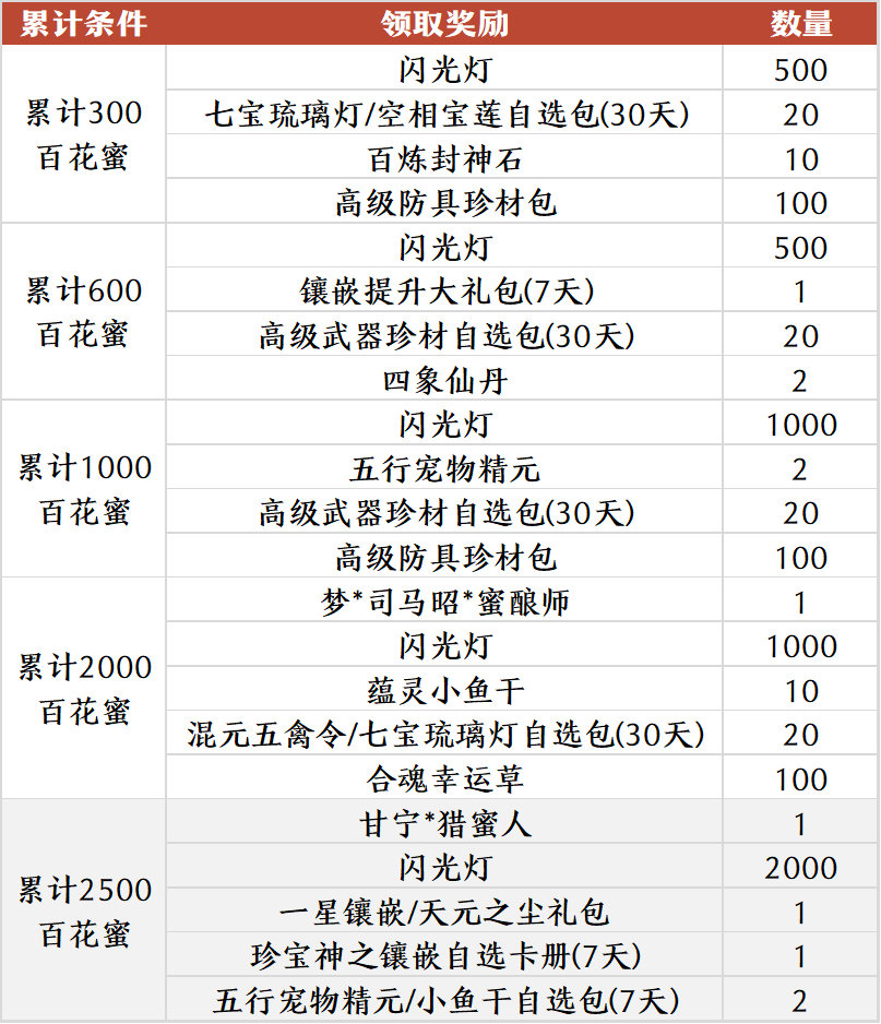 仙术师们莫急,等梦梦先爆金秋活动,爆完金秋爆阿斗,爆完阿斗爆竞技月…咱心里有数,10月新版本这种场面都在控制之中。 秋高气爽天转凉,梦梦迫不及待献上暖心的甜蜜补给——10月16日-11月9日,活跃免费得闪光灯、梦*司马昭换装,还有甘宁换装、一星镶嵌卡等更多好礼待解锁! 活动时间 2025年10月16日-2025年11月9日 活动玩法 活动期间,仙术师通过活跃任务获得指定数量的百花蜜,免费带走3000闪光灯、梦*司马昭换装、防具/武器/宠物材料等。 若解锁相应数量的周年扫码包,还可额外领取2000闪光灯及甘宁换装等。 戳图片查看梦*司马昭&甘宁换装技能 活动奖励 铃儿响蜂儿忙,要想领奖励,先攒百花蜜!仙术师签到、活跃、解锁扫码包都能获得百花蜜,任务及数量如下表所示: 梦梦算过啦,活动期间最多免费可得2150百花蜜,若解锁5个周年放映机扫码包,能直接拿到800百花蜜,加速奖励领取! 秋意浓甜蜜蜜,有了百花蜜,究竟能领啥?自然是闪光灯、换装、各类珍材应有尽有—— 梦梦省流总结:仙术师们可免费获得包括3000闪光灯、梦*司马昭*蜜酿师、小鱼干等在内的前四档奖励。 解锁5个扫码包后还能领取最后一档甘宁*猎蜜人、2000闪光灯、一星镶嵌卡/开孔包自选、珍宝神之镶嵌卡册、小鱼干自选奖励~ 镶嵌提升大礼包(7天) 混元五禽令/七宝琉璃灯自选包(30天) 一星镶嵌/天元之尘礼包 珍宝神之镶嵌自选卡册(7天) 五行宠物精元/小鱼干自选包(7天) 这蜜似的白嫖奖励,是不是甜到仙术师们的骨子里去啦?别的不说,梦司马和甘宁的“邪恶小蜜蜂”换装,梦梦必拿下!金秋活动将在10月16日全服版本更新后开启,大家放心冲~ [编辑:月光下完美]