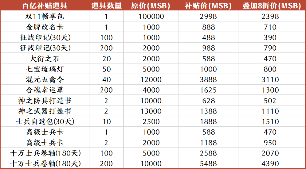 双11狂欢节即将开启,一年一度特价专场来袭!仙术师们坐稳咯,快上车—— 10月30日-11月12日,闪光灯、紫仙玉、改名卡、畅享包、祥瑞灵珠等紧俏好物随心购,百亿补贴折上折,消费积分等你兑,优惠力度大到超乎想象! 活动时间 2025年10月30日-2025年11月12日 活动玩法 ●[自选宝库]:仙术师在三个宝库中挑选好物打包购买,有概率额外获赠1件道具(超值自选库必得额外道具)。 ●[百亿补贴]:邀请三位好友完成助力可得8折券,购买百亿补贴内的畅享包、改名卡、珍材士兵等特价道具时打折上折。 ●[狂欢商店]:个人在活动中消费的梦三币可1:1转化为积分,用于狂欢商店兑换心仪道具。 自 选 宝 库 双11自选宝库有超值/进阶/高级3种档位,售价依次为111梦三币、1111梦三币和11111梦三币,可选购闪光灯、紫仙玉、祥瑞灵珠、万灵幻晶、金乌之烬等道具。 超值自选库(111梦币) 超值自选库每次能选择3件打包带走,必定获赠1件宝库内的随机道具,限购3次。 进阶自选库(1111梦币) 进阶自选库每次能选择5件打包带走,有概率获赠1件宝库内的随机道具,限购4次。 天元之尘开孔包 十万士兵卷轴/烽火兵符自选礼包 高级自选库(11111梦币) 高级自选库每次能选择6件打包带走,有概率获赠1件宝库内的随机道具,限购5次。 万灵幻晶/祥瑞灵珠自选包 灌顶注能自选礼包 仙魂觉醒石自选礼包 百 亿 补 贴 百亿补贴,折上折拿来吧你!除自选宝库外,仙术师可在百亿补贴直购畅享包、改名卡、大衍之石、五禽令、士兵等特价好物。 若成功邀请3位好友助力,还能领取1张8折券和1份助力包(内有两万士兵卷轴*5、紫仙玉*100、蓝色幸运符*3)。 获得8折券后,参与补贴的好物都能享受叠加折扣优惠! 例如此次全新的双11畅享包,叠加折扣后2398梦三币,可带走包括闪光灯*6000、暗金元神卡一级*1、灵珠/小鱼干自选*10、灌顶注能礼包*1、天元之尘开孔包*60在内的全部道具! 双11畅享包 当然除畅享包外,下列好物都能参与折上折(每种道具限购1次)—— 狂 欢 商 店 消费福利,珍稀道具等你兑!此次双11活动中,个人消费的梦三币将1:1转化为狂欢积分,用于商店兑换心仪道具。 商店的宝物也是亮点多多,灵珠、暴怒炎魔卡、周年小队离队卡、紫仙玉、五行宠物精元等等,满足大家的个性化需求~ 省流!梦梦聪明的小脑瓜已帮大家算好: 折上折消耗2398梦币拿下双11畅享包,即可额外兑换千万士兵卷轴、千份紫仙玉或其他珍材道具。 如果缺闪光灯,那么自选库+双11畅享包是首选,拉满最多能拿65788闪光灯,且积分商店全场任兑。 如果缺灵珠,最少购买3次进阶自选库+双11畅享包,就能再获得商店的10个灵珠,共计拿到26个灵珠;宝库+畅享包拉满最多得58个灵珠,其余商店道具任意兑。 别的不说,双11畅享包梦梦是真心动了,巨巨巨划算!有需要的仙术师别忘记捡漏啦~ [编辑:月光下完美]
