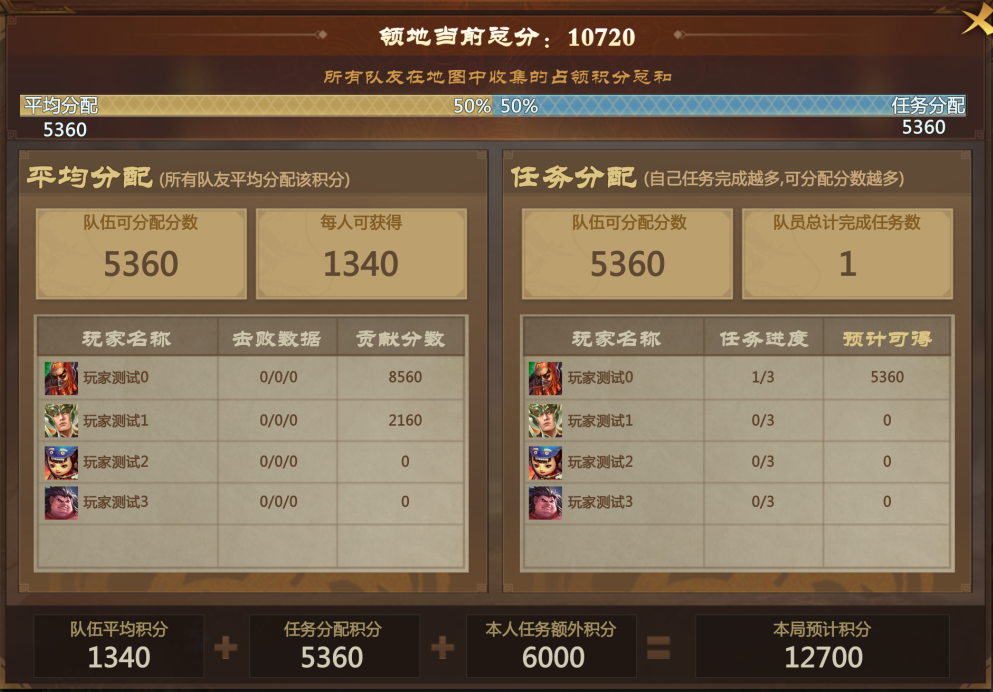 来来来看黑板,打领地总有点不得劲儿?高神兵明明输出拉满,积分却难拿?队友挂机划水,自己奋勇破敌最后还同分? 这些仙术师集中吐槽的问题,我们说改就改!为解决“高神兵积分难”和“队友挂机坑”,11月版本将进行领地专项优化,涉及全新任务机制和占领积分分配,期望带来更顺、更爽的领地体验。 接着由梦梦为大家深入解析此次改动,小讲堂开课啦! 引入局内领地任务 嘉年华版本更新后,每次进入领地战地图时,会自动接取3个领地单局任务,完成任务可获得独有的占领积分和军饷奖励。 团队任务 必定随机接取1个团队任务,团队内共享任务进度,任务完成后全员都能获得对应的任务奖励。团队任务有(部分展示): 团队累计拾取20000金币(需在队友附近1500码)。 团队累计拾取60个积分旗帜(需在队友附近1500码)。 …… 个人任务 必定随机接取2个单人任务,须自己完成才可累计进度,任务完成后仅自己获得对应的任务奖励。个人任务有(部分展示): (个人)参与击败5名敌方英雄。 (个人)累计与10名不同敌方英雄交战。 (个人)坚持生存至少11分钟不被淘汰。 …… 注:本次领地任务为测试版,任务难度适中比较容易完成,后续会依据仙术师建议增加更多挑战性和趣味性的领地任务。 任务奖励 任务完成必定获得占领积分和军饷奖励。 通过任务获得的占领积分奖励败阵不会掉落,且不会参与队友分配,固定由自己全部获得。 占领积分奖励拥有神兵值加成,即自身神兵值越高,能够获得的占领积分奖励越高。 占领积分分配调整 先前的积分分配堪比“大锅饭” ——不管是冲锋杀怪攒分,还是全程躺平划水,最后拿到的积分都一样,并最终影响账册的排名奖励。这对活跃行为较高的仙术师并不公平。 因而本次专门优化了规则,既保证人人有份,又会让干活的人拿更多!最终积分直接影响排名奖励,付出越多收获越大~ 全新分配规则 新的分配规则也十分简单,仙术师们只需记住两步—— ①一半积分平分,保底匀给全员。 这局队伍一共收集到的占领积分,先拿出50%给全队所有人平均分。 ②另一半积分按任务完成比例算,多劳多得。 剩下的50%积分,按照每位成员的任务完成比例瓜分。 每人的任务完成比例=你完成的任务数÷全队任务完成数。 简单来说,任务做得越多,分配的比例越大,获得的占领积分就越高~ 分配例题演算 没看懂咋算的?别急,学习完梦梦的这道例题大家就都会啦~ 假如:梦梦的5人小队在本局收集了1000占领积分。梦梦自己完成3个任务获得300额外积分,剩下的四个队友一共完成了3个任务。 那么:①?第一步1000分的50%全队平分,每人可得(1000*50%)÷5=100分; ②第二步剩下的50%按任务比例瓜分,梦梦能拿(3÷6)*(1000*50%)=250分; ③第三步别忘了还有完成任务额外获得的300积分,败阵不掉落且不参与分配; 因此:本局梦梦最终获得的积分为——100+250+300=650分! 与划水队友拉开了较大的差距,正所谓他混任他混,我自天道酬勤狠狠拿分! 常见问题答疑 仙术师们可能就要问了—— Q:如果全队都没有完成任何一个任务,能获得任务分配的积分吗? A:若全队都没能完成任务,则本局的占领积分还是按照全队平均分配。 Q:我完成任务获得的独有积分奖励会参与分配吗? A:不会!完成任务获得的额外积分奖励不参与分配,由自己独享,且还享受天赋加成。 此外,新版本领地还将提前皇城战的争夺时间(不用熬夜打皇城啦),并提高争夺奖励价值。总之专项优化多多,仙术师可还满意?咱们11月嘉年华不见不散哦~ [编辑:月光下完美]