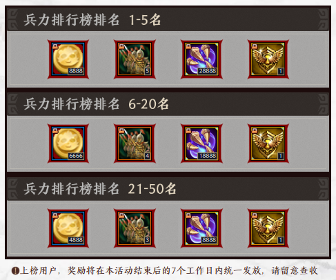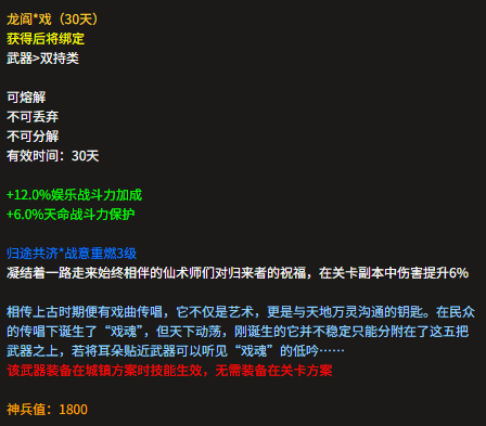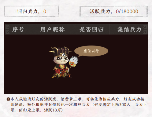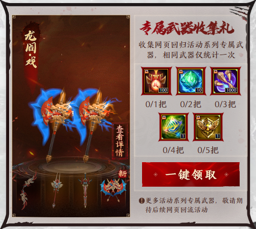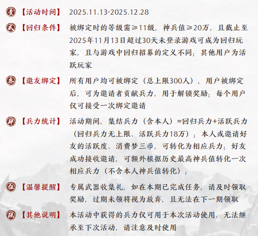 嘉年狂欢,好礼不停!梦梦再来加加加加加点料—— 全新双持武器龙阎·戏登场!金色龙头怒目獠牙,赤蓝锋刃凌厉逼人,红焰纹饰在刀身游走,似有岩浆奔涌。 龙阎·戏 暴力美学 艳丽撞色 外观/属性加成与“戏魂”系列一脉相承 够霸气!够威武!梦梦掐指一算,非诸位莫属!你问此等神器如何获取?参与回归网页活动即可!还有古法沉香、封疆宝匣、竞技冠军封灵玉等福利打包奉上~ 活动时间 2025年11月13日-2025年12月28日 活动玩法 ●活动期间,仙术师个人及绑定好友的活跃度、消费情况均可转化为兵力,用于解锁封疆宝匣、古法沉香、限时武器“龙阎·戏”等奖励。 ●按个人贡献的兵力值,也可领取封灵玉、紫仙玉等好礼;活动结束时总兵力排名前50的,还能获得绑币、士兵、紫仙玉和称号。 锐骑破阵 丰厚犒赏 活动期间,仙术师可依据个人的活跃度、梦三币消费情况转化为兵力,领取个人贡献度奖励。 转化兵力分别达到1万/3万/5万/8万时,依次领取寰宇天罡石*5、竞技冠军封灵玉*1、藏龙紫仙玉*1500、五行宠物精元/小鱼干自选*4。 个人兵力贡献度奖励 竞技冠军封灵玉自选包(30天) 要注意咯,若仙术师为回归用户(等级≥11级;神兵≥20万;截至2025年11月13日超过30天未登入游戏,与游戏内定义不同),个人可转化的兵力无上限;若为活跃用户,个人转化兵力上限为18万。 同袍征战 邀友领礼 除个人兵力外,仙术师也可邀请好友集结兵力,解锁更多犒赏。 接受邀请的好友的活跃度、梦三币消耗情况都会转化为兵力(回归好友转化无上限,活跃好友上限18万),且每次成功邀请时可依据神兵值额外转化1次相应兵力。 邀请的好友上限300人,每位好友接受邀请能获得1份赠礼(仅可接受1次邀请绑定),内有藏龙紫仙玉、十万士兵、活跃自选包。 仙术师集结的兵力每达到10万,可领取相应奖励(最多领4次),包括封疆宝匣、古法沉香、限时武器龙阎·戏、四象仙丹等。 其中封疆宝匣内有藏龙紫仙玉、凝魂碎玉(可用于合成卷轴)、一星镶嵌/天元之尘礼包、祥瑞灵珠/小鱼干自选,开启4次得全部道具。 封疆宝匣(30天) 龙阎·戏(30天):有效期30天 书院士兵卷轴自选包 此外,收集“戏魂”系列武器还能获得额外奖励,集齐4把可领珍宝神之镶嵌卡册! 集结兵力 论功行赏 活动期间仙术师们最多能扩列邀请300位好友,梦梦照例设置了兵力排名奖励—— 活动结束时兵力排名前50位,最高可领取8888绑币、千万士兵、28888藏龙紫仙玉、暗金称号。 集结兵力排名奖励 问鼎中原定乾坤(时限称号):有效期7天 双持已出,至此“戏魂”系列只差一把拳爪武器尚未露面,仙术师们敬请期待咯~ 最后是梦梦的温馨提醒:双11狂欢节将于11月12日结束,有需要的抓紧前往扫货! [编辑:月光下完美]
