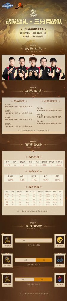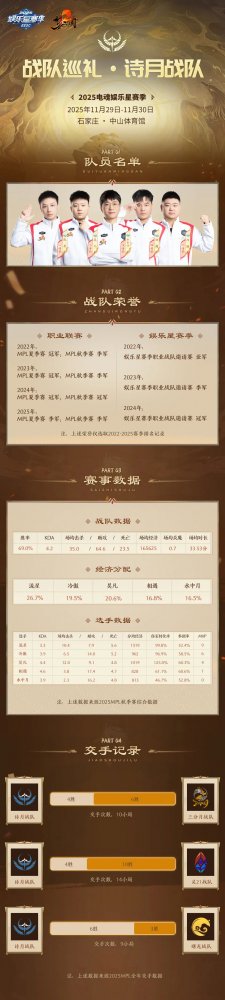 2025电魂娱乐星赛季,即将于11月29日 - 11月30日在石家庄中山体育馆举办。MPL职业战队邀请赛四强战队:灵21、曙光、三分月、诗月,即将踏上夺冠征程。 今日放出的是MPL老牌劲旅三分月 & 诗月的战队出征海报及战队实力介绍。如果两队是你心中夺冠的候选战队,请即刻前往星赛季专题页参与赛事晋级预测哦~ 星赛季战队巡礼 · 三分月 三分月:燃血为刃,向上而生 在梦三职业联赛史册中,三分月是继希望、零点之后,第三支被仙术师称为“赛场统治者”的队伍。从2016年建队以来,在职业赛场沉浮2年后,于2018年MPL夏季赛正式开启了称霸之路,连续8年16个赛季,从未缺席MPL季后赛以及年末的星赛季的职业战队邀请赛。 三分月 · 队伍简介 8年间勇夺6次MPL赛季冠军,3次星赛季总冠军,3套冠军皮肤,这些荣誉见证了这支队伍的鼎盛时期。 三分月最大的特点便是其极强的人员稳定性,并肩战斗过数年,山鬼谣、小虎、张子凡、果仔、烤蟹,他们5人的默契几乎已经成为肌肉记忆,随时都有可能爆发出强大的战斗力,改写比赛局势的走向! 近两年,三分月的成绩如同坐上了跷跷板,时而处于高处,时而触及地板。他们既可以在常规赛中大杀四方,小组第一出线,展现出强大的统治力,却也会在之后的直升赛、季后赛中相继失利,翻车爆冷止步殿军。多次失利后,强队的心态和状态都会发生一定变化,三分月需尽快克服、化解之前比赛失利所带来的心理和舆论层面的压力。 星赛季战队巡礼 · 诗月 诗月:诗月凌霜,破阵成章 如果说MPL历史上谁是“赛场抗压王”,那几乎所有人会认证“诗月”是这个称号的第一顺位拥有者。2017年,诗月击碎零点战队蝉联职业大满贯的梦想,沉浮两载后,诗月于2019年开启了和三分月在总决赛舞台上分庭抗礼的时代! 诗月在2017 - 2025年,摘得7次MPL赛季冠军头衔,3次星赛季总冠军。诗月是梦三职业联赛史上MPL单赛季冠军纪录保持者,同时也是第二支拿到全年职业大满贯的战队。 诗月 · 队伍简介 诗月自建队以来,经历了N次坎坷,诗月在进入MPL联赛的前3、4年间一直在反复经历转会期超级大换血这种变动带来的一切负面后果。但皇天不负有心人,带着破釜沉舟的勇气以及对胜利的渴望,诗月关关难过关关过。两项记入MPL史册的纪录,是诗月努力拼搏多年的最佳回报。 作为老牌强队,诗月今年亦陷入了和三分月同样的“阵痛期”。2024年三个冠军之后,2025年MPL夏、秋2个赛季均只交出了季军的成绩单。 两队仿若实力深厚却状态起伏的武林名宿,对手永远无法轻视他们,因为他们随时可能用一记绝招让局势逆转,重登巅峰! 顶级的操作、丰富的决赛圈对决经验,是三分月、诗月两队拥有的绝对利器。今年的星赛季终极对决,将是两队的破局之战。 版本的更迭需要三分月、诗月这些老牌强队尽快做出调整和变阵,星赛季的版本各路英雄百花齐放,梦三的比赛再也不是一号位统领全局一枝独秀的时代。 同时,两队应该更为重视对手为了获胜而下的决心和付出的努力,不可自大轻敌,陷入“下一场再好好打”的心态。尝试准备切实可行的“Plan C”甚至“Plan D”,利用好队员的自身特点和优势,在比赛运营中化作尖刀划开对手设置的“防守线”,将赢下去的状态持续到最后一刻。 星赛季征战号角即将吹响,两支老牌强队再次整装待发,踏上夺冠征途。他们能否用成绩宣告王者归来,就让我们拭目以待! [编辑:月光下完美]