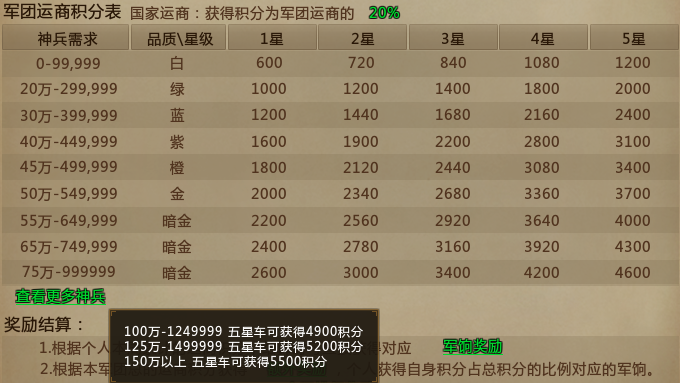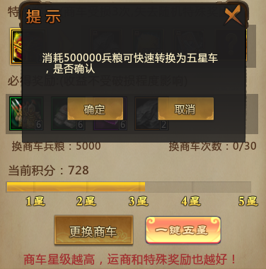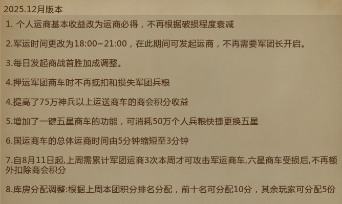 星赛季即将开战,梦梦严阵以待的同时,也不忘从前线偷点情报(bushi……本期就先向各位汇报12月版本的更新内容——商会优化! 策划这样说 近期收到了不少针对商会的反馈,诸如“辛苦运一趟,军团资源被打劫到血本无归”、“奖励有点差”、“刷不到五星商车” 、“运商时间太长”此类的吐槽。 为了能让仙术师们更开心地体验商会玩法,告别“人在囧途”的窘境,12月征战版本将为大家带来全新的商会(优化版)! 优化主要围绕以下几个核心目标: 1-减轻负担:移除破损减少基础奖励的设定,降低军运的门槛和损失,希望让更多仙术师参与商会。 2-提升奖励:提高运商奖励,增加更高神兵值的商会积分加成。 3-优化体验:增加便捷刷车功能,缩短运商时间,让大家玩得更轻松愉快。 接着一起来看看具体有哪些调整~ 运商收益调整 首先从收益调整说起,本次商会将着重提升运商基础收益、部分商车奖励、商战首胜加成等,免去部分损失,优化整个运商环节的流程体验。 个人运商必得,告别破损焦虑! 12月版本更新后,个人运商的基础收益调整为运商必得,不再根据破损程度增加损失。 军团运商大解放,资源不心疼! 优化后押运军团商车时不再抵押和损失军团兵粮,军团长们再也不用心疼那些兵粮啦~大胆开启军团运商,带领大家走上致富路! 高品质商车奖励升级! 此次更新将调整五星商车和六星商车的运商奖励,并且增加75万神兵以上的运商积分加成,神兵值越高的仙术师,运商收益越高!快去提升神兵成为商会大佬~ 五星商车特殊奖励(1天) 六星商车特殊奖励(1天) 军团运商积分表 新增一键五星商车! 刷30次才出5星商车?新版本将增加 “一键五星商车” 的功能,仙术师在选择商车时可以消耗五十万个人兵粮一键更换为五星商车,以此获得更丰厚的奖励。 商战首胜加成调整! 此外还有商战首胜加成调整,与目标神兵值挂钩,商战目标与自己的神兵值越接近,获得的商会积分越多,建议仙术师在每日首战中选择更合适的对手获得更高的积分。 运 商 时 间 调 整 除运商收益外,12月版本也将对运商时间作出调整。 国家运商提高效率! 缩短运商时间,国家运商的商车运输时间缩短至三分钟,效率大大提升! 军团运商自由开启! 军团运商时间更改为18:00-21:00,且不再需要军团官员开启,在此期间内,仙术师可直接发起军团运商,时间更集中更方便! [编辑:月光下完美]