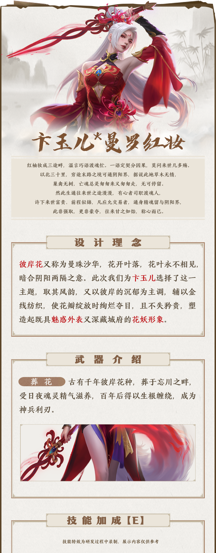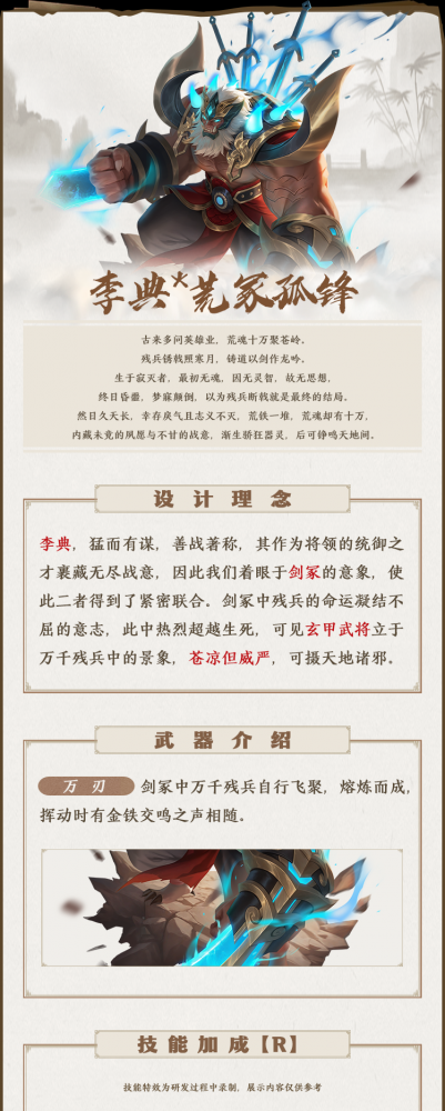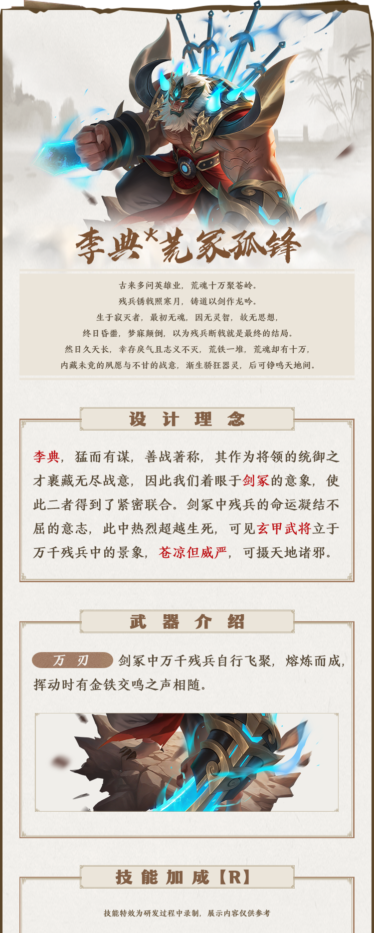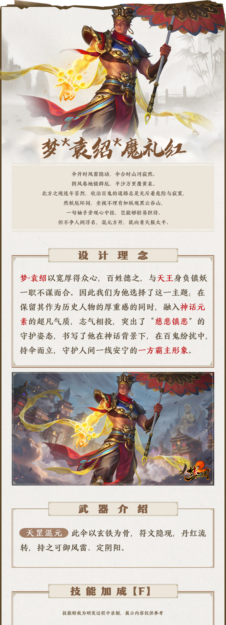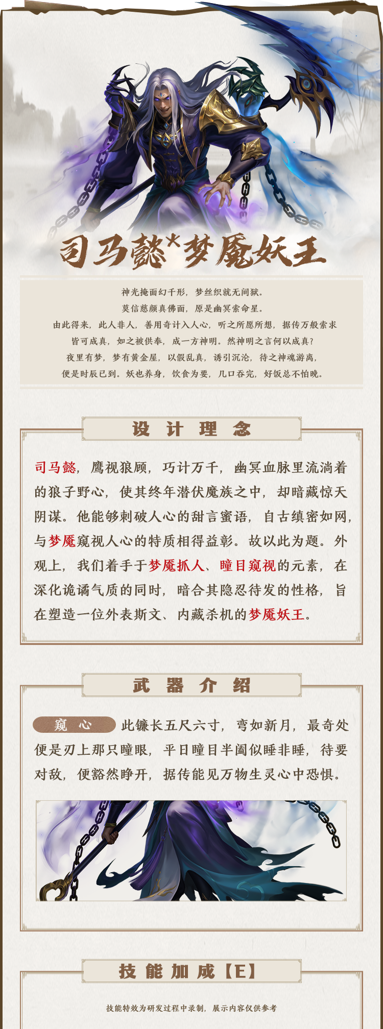 莫急莫急,12月版本新换装情报,梦梦这就一锅出!历经海鲜系列、地府系列、荷花系列的审美积累,此次虽名为“百鬼”系列,但没人能顶得住! 不信?有请出全新征战五人组——魅惑花妖卞玉儿、忠魂不败姜维、威猛善战李典、阴湿腹黑司马懿、天王法相梦*袁绍! 换装背景 浩浩乎,平沙无垠,远近残旗野竖,擂鼓矢音力竭弦绝。此古战场迩来不知岁月几何,曝霜寒而杳人烟,鸟无声而山寂夜,终迎鬼哭夜啸泱泱登临。 世多传闻,此地因枯骨积聚,招致鬼哭,天阴闻之,势多猖獗。后至天听,有多闻天王魔礼红,掌“混元伞”“镇妖塔”奉命收治此地,天威得摄妖鬼,声势力析山河,至此成禁地,又因聚集妖鬼众多,被授名“百鬼荒原”。 然镇门之力岁削月铄,百鬼为破禁制,盟于其中,愿觅良机再返人间。是为不轨?或将荼毒生民,行倾覆之举?或有摧世之力者逆水行舟,不惜万里奔走…… 行长路,方知人妖鬼悬于一线,是非曲直善恶恩仇,无有大道分别。 才大悟,苍苍战场,系骨众多,妖即是妖,鬼即是鬼,人即是人,天下古今,何可胜言。 纵是难分,难解,生于天地者不可作祸,立于山湖者不可倾覆,天王当再赴战场侦办此乱,仙术师,可愿同往? 上下滑动查看完整背景 [编辑:月光下完美]