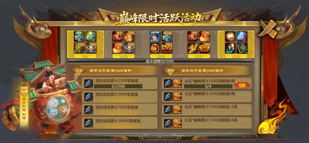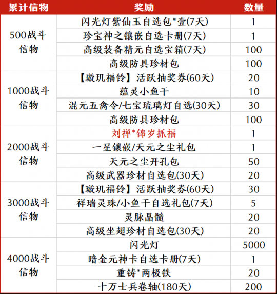 家人们,天大的好消息!梦梦收到前线情报,1月新版本主打“送送送”模式: 刘禅换装,送!6000闪光灯,送!50张春节活动抽奖券,送!祥瑞灵珠、一星镶嵌卡、暗金元神卡、灵脉晶髓、重铸两极铁……统统免费送! 完成活跃任务攒信物,丰厚奖励打包带走,快随梦梦去瞅瞅~ 活动时间 2026年1月8日-2026年2月1日,近月余充足时间,不用熬夜肝! 活动说明 活动期间仙术师参与竞技/出征,累计军威值或完成出征*巅峰战绩值任务,即可获得战斗信物,领取对应的信物奖励。 任务将按周解锁,直至第三周开放完毕(最快第三周就能领取全部奖励): 1/8-1/11:解锁第一排军威值和出征*巅峰战绩值任务,最多可得1000战斗信物; 1/12-1/18:解锁第二排军威值和出征*巅峰战绩值任务,累计可达2000战斗信物; 1月19日及之后:解锁全部任务。 活动奖励 累计10000军威值,完成16局出征*巅峰任务(每完成4局得信物和长生殿珍材),可拿走全五档信物奖励—— 第一档500信物奖励,除了1000闪光灯/紫仙玉自选,还有最新章节精元和材料,防具珍材包内也增加了两万士兵卷轴,仙术师可按需选择~ 闪光灯紫仙玉自选包*壹(7天) 高级装备精元自选宝箱(7天) 高级防具珍材包 第二档1000信物奖励,可提前领取20张马年春节活动抽奖券! 第三档2000信物奖励,全新刘禅换装直接兑换!收藏党必冲!一星镶嵌卡和开孔包也请笑纳~ 一星镶嵌/天元之尘礼包 第四档3000信物奖励,30张春节活动抽奖券继续加码,5颗灵珠、20个灵脉晶髓顺道带走~ 祥瑞灵珠/小鱼干自选礼包(7天) 第五档4000信物奖励,5000闪光灯直接拉满,暗金元神卡、重铸*两极铁、两千万士兵卷轴必须拿下! 暗金元神卡自选卡册(7天) 开年新版本“我免费啦”,送完这个送那个,除了巅峰限时活动,12章福利活动也会紧随其后,诸位燥候! [编辑:叶子猪小秘书]
