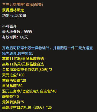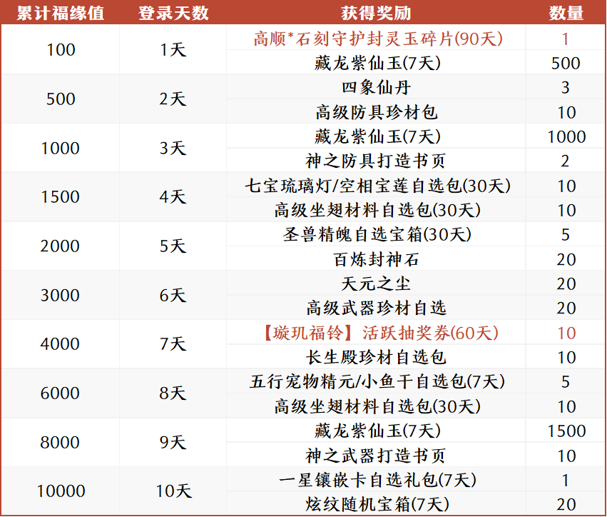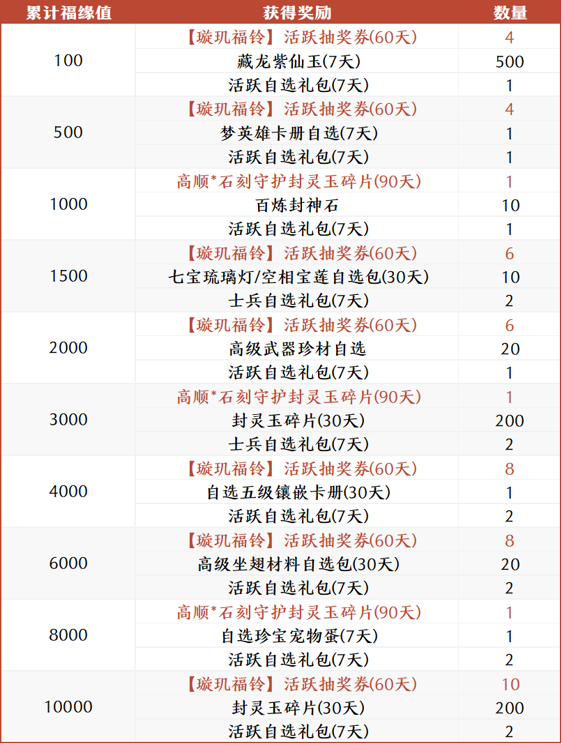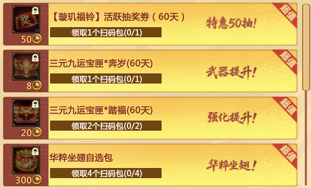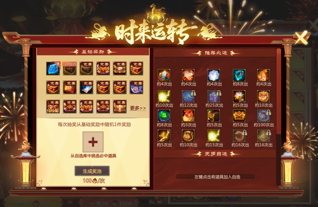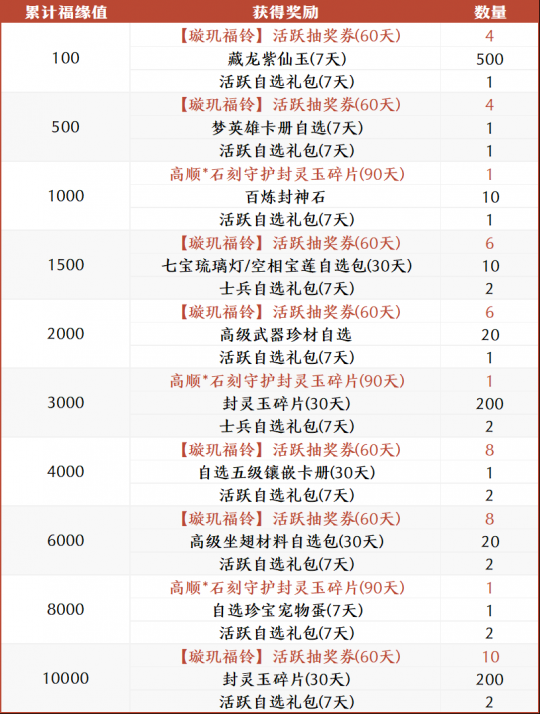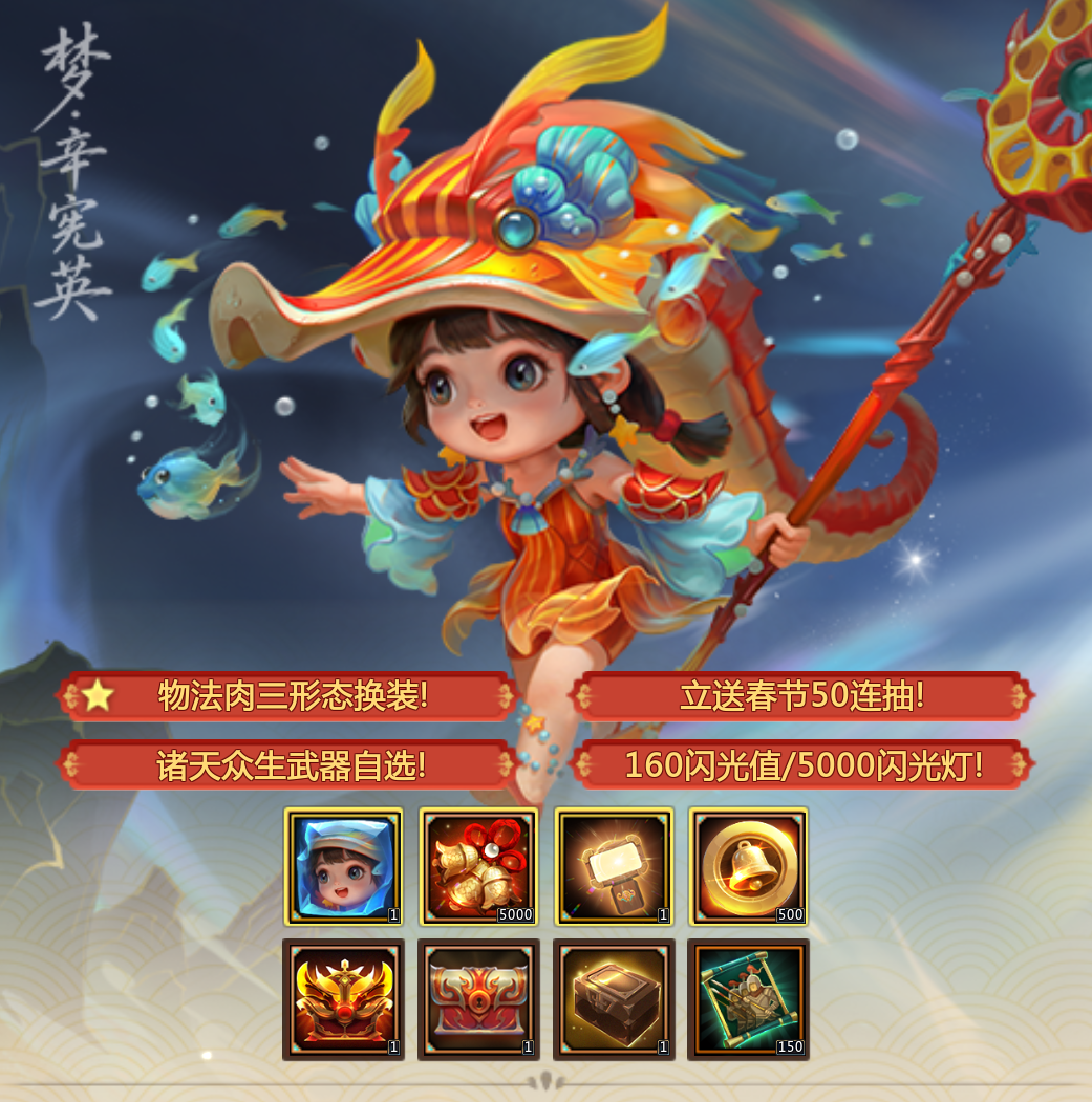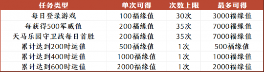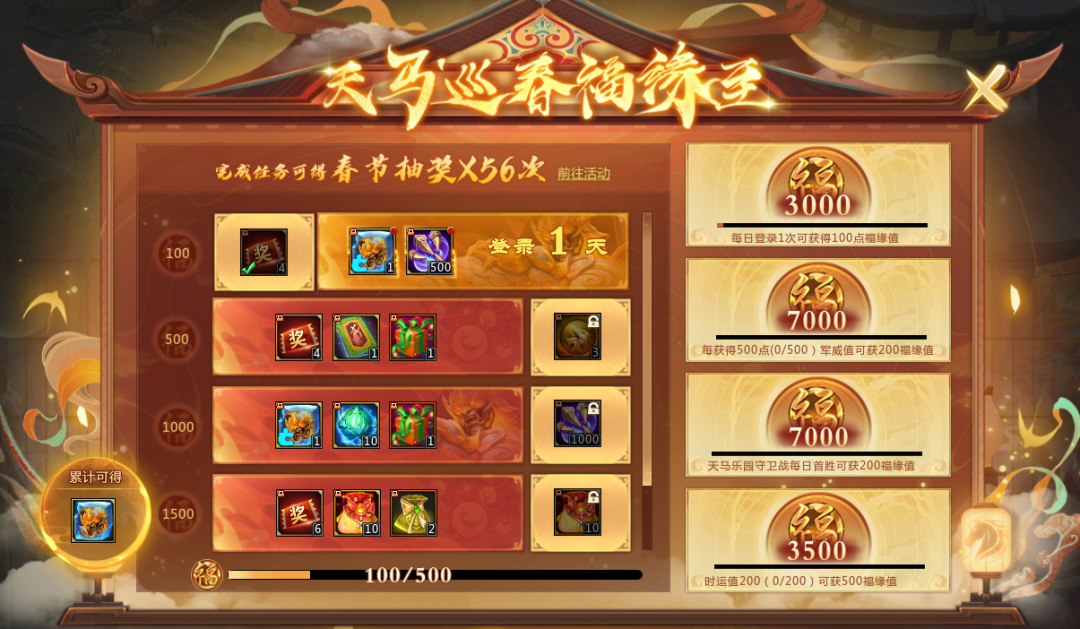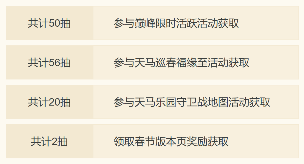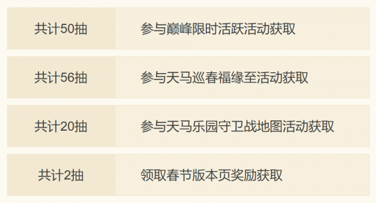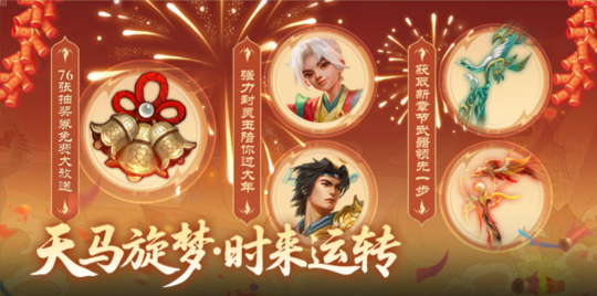 桃符辞旧,椒酒初温,属于梦三人的新春盛典『天马旋梦?时来运转』活动,将于1月29日踏祥云而至! 这次,天马族衔来满满的福缘与贺礼——免费百余抽奖励、强力换装、成品装备/宠物、新武器材料等等,超值好礼爽不停~ 1月29日-4月20日,春节活动献上四重好礼: 一重礼【超值特惠包】:仙术师能以超值折扣获取新春换装、璇玑福铃(价值1梦币)、时运值(价值10梦币)、闪光灯等。 二重礼【时运值兑奖】:时运值由购买特惠包附赠得到,使用时运值可兑换华粹坐翅自选等奖励。 三重礼【璇玑福铃抽奖】:每消耗100璇玑福铃进行1次抽奖(自选奖励+基础奖励组成抽奖库),随机获得1件基础奖励和1件额外奖励,特定次数时必得自选奖励。 四重礼【免费百余抽】:通过游戏签到、地图活跃、网页活动等免费获得超128次抽奖机会。 PS:巅峰限时活动将于2月1日结束,请仙术师们注意时间和奖励领取~ 超 值 特 惠 包 首先是大家最关心的超值特惠包,分为五款封灵玉礼包和时运值特惠包。 曹 冲 * 天 马 旋 梦 礼 包 礼包内有:曹冲*天马旋梦*1、璇玑福铃*3000、闪光灯*2000、时运值*300、圣灵宠物自选福袋*1、新春福袋*1、乾坤宝匣*神骥璇玑*1、十万士兵卷轴*100。 圣灵宠物自选福袋 新春福袋(30天) 吴 凤 熙 * 山 海 吉 量 礼 包 礼包内有:吴凤熙*山海吉量*1、璇玑福铃*3000、闪光灯*2000、时运值*300、圣灵宠物自选福袋*1、神机玄灵武器珍材包*20、乾坤宝匣*神骥璇玑*1、十万士兵卷轴*100。 神机玄灵武器珍材自选包(30天) 马岱 * 骏马迎春礼包 礼包内有:马岱*骏马迎春*1、璇玑福铃*4000、闪光灯*4000、时运值*400、封神坐翅成长自选礼*1、高炼10防具/灵脉晶髓自选*1、乾坤宝匣*神骥璇玑*1、十万士兵卷轴*120。 封神坐翅成长自选礼包(30天) 梦辛宪英 * 海 马 绮梦 礼 包 礼包内有:梦*辛宪英*海马绮梦*1、璇玑福铃*5000、闪光灯*5000、时运值*500、诸天众生星月武器*1、高炼10武器/灵脉晶髓自选*1、乾坤宝匣*神骥璇玑*1、十万士兵卷轴*150。 诸天众生星月武器自选 公 孙 瓒 * 天 马 将 军 礼 包 礼包内有:公孙瓒*天马将军*1、璇玑福铃*6000、闪光灯*6000、时运值*600、2级白虎朱雀自选*1、高炼10坐翅/灵脉晶髓自选*1、乾坤宝匣*神骥璇玑*1、十万士兵卷轴*200。 2级白虎朱雀自选宝箱(60天) 梦梦算过啦,五款封灵玉礼包可直接获得21000福铃、2100时运值、19000闪光灯、680闪光值,并集齐5个乾坤宝匣*神骥璇玑,额外开出10000福铃、20颗灵珠等道具~ 乾坤宝匣*神骥璇玑(30天) 时 ?运 ?值 ?特 ?惠 ?包 此外,仙术师还可购买时运值500/550/600档特惠包,获得大量福铃、时运值、九龙宝匣*白驹。其中白驹宝匣每次开启必得10灵珠,最多得250灵珠! 九龙宝匣*白驹(60天) 时运值兑换 集时运攒福气,仙术师可凭借时运值兑换各类珍稀道具,如福铃抽奖券、华粹坐翅自选、传说宠物、左辞/夏侯渊/于禁换装等,助力装备成长和强化提升。 解锁换装礼包 解锁指定数量的封灵玉扫码包后,能以超低时运值兑换高价值奖励,梦梦先展示一波: 解锁1个扫码包,消耗50时运值兑换50【璇玑福铃】活跃抽奖券;解锁4个扫码包,可消耗100时运值兑换100抽。 解锁1个扫码包,消耗200时运值兑换冠军封魔封灵玉礼包。 冠军封魔封灵玉自选礼包 解锁1个/2个/3个扫码包,可分别消耗8/20/30时运值,兑换奔岁宝匣、踏福宝匣、扬风宝匣。 三元九运宝匣*奔岁(60天) 三元九运宝匣*踏福(60天) 三元九运宝匣*扬风(60天) 解锁3个扫码包,消耗200时运值兑换诸天众生星月武器。 解锁4个扫码包,消耗1时运值兑换午马*神骏踏春称号;消耗300时运值兑换华粹坐翅自选包。 午马*神骏踏春 华粹坐翅自选包 解锁5个扫码包,消耗1时运值兑换高级宠物技能书自选;消耗300时运值兑换传说宠物自选包。 高级宠物技能书自选宝箱 传说宠物自选包 累计相应时运值 当然,满足特定的时运值累计条件,也可兑换珍材和稀有道具,如百炼灵珠、高炼11防具/武器/坐翅、玉佩神卡自选包、2级/3级白虎朱雀宝箱、高级天赋神卡、二重地魂觉醒卷轴、四重仙魂觉醒卷轴等等。 高级天赋神卡自选 璇 玑 福 铃 抽 奖 仙术师每消耗100璇玑福铃抽取1次奖励,特定次数必得自选奖励,每次抽取赠送随机基础奖励和保底奖励。 自选奖励 自选奖励,即从时来运转宝库中自选心仪道具放入奖池,抽取约标记的次数后必得该奖励。 宝库奖励包括小鱼干、十章/十一章武器材料、寰宇天罡石、百炼封神石、祥瑞灵珠、万灵幻晶、仙魂觉醒石、马年纪念金币等。 随机奖励 每次抽奖都会从基础奖励中随机获得1份奖励。 随机基础奖励包括新春惊喜宝藏、诸天众生武器自选、高炼12防具(武器)/灵脉晶髓自选、黄金闪耀宝藏包、星月武器、天地劫神魔道武器、圣灵宠物包、十一章防具、元神转换符等。 新春惊喜宝藏(30天) 黄金闪耀宝藏包(30天) 保底奖励 前150次抽取每次必得封灵玉碎片*2,150次后每次抽取必得宠物元神*1。 准备好迎接盛大的春节活动了嘛?别急,梦梦还有个纯白嫖活动『天马巡春福缘至』,能免费带走56张抽奖券、高顺换装、一星镶嵌卡…的那种,也请仙术师们笑纳~ 天马巡春福缘至 活动期间,仙术师完成活跃任务可积攒福缘值,领取对应的档位奖励。同时,规定时间内登录游戏界面,还能额外领取登录奖励。 活动时间 任务开放&福缘奖励领取时间:1月29日-4月5日; 登录奖励领取时间:2月25日-4月5日。 福缘奖励
