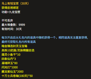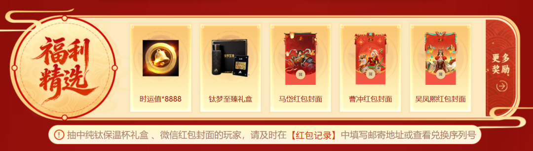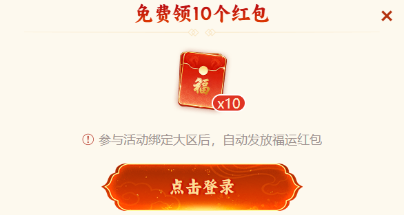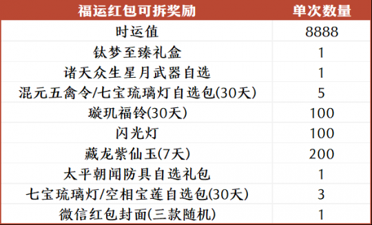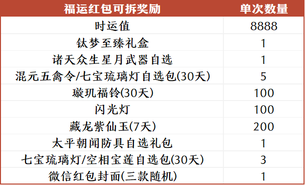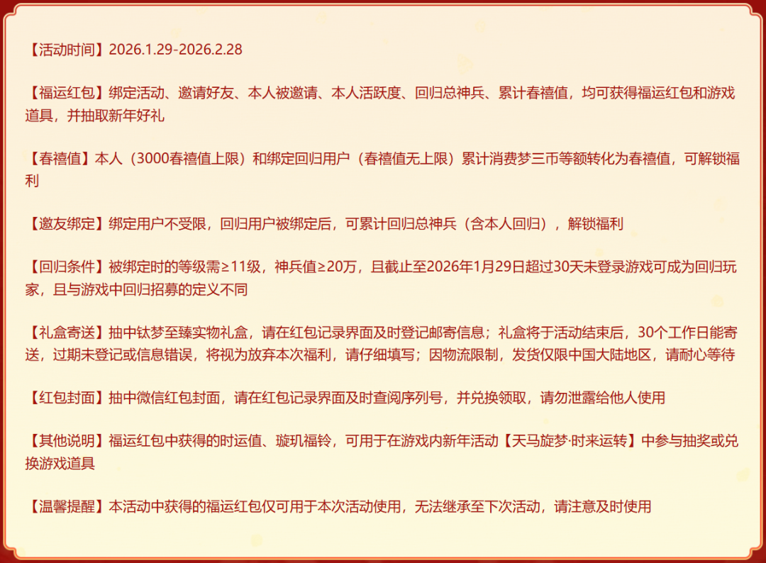 红包来,鸿运来,喜事策马奔腾来!腊八已过,年味更浓,梦梦迫不及待奉上传统节目——拆红包活动咯~ 这次真得收下了,且不说红包配置拉满:8888时运值、钛杯实物礼盒、诸天众生星月武器、十一章防具、璇玑福铃、闪光灯、微信红包封面等等看花了眼…… 梦梦上来先送一波免费十连抽,全体仙术师都有份!手气是欧是非,统统不白来嗷~ 活动时间 2026年1月29日-2026年2月28日 活动玩法 ●仙术师参与活动绑定大区,立领10个福运红包,开启幸运十连,抽8888时运值、礼盒、红包封面等好礼。 ●活动期间个人活跃/春禧值、好友互邀、绑定回归玩家累计总神兵/春禧值,均可获得福运红包。 ●拆红包达到指定次数额外领进度奖励;活跃度、总神兵、春禧值满足对应条件还能领马上有钱宝匣。 首先说说免费的十抽~仙术师们在活动期间登录网页绑定大区,就能直接领取10个福运红包。 拆福运红包,有机会开出8888时运值、璇玑福铃,可用于『天马旋梦?时来运转』活动抽奖或兑换奖励。 福运红包内还有钛杯实物礼盒、三款微信红包封面、诸天众生星月武器、十一章防具包、闪光灯、紫仙玉、五禽令,等待仙术师们抽取~ 诸天众生星月武器自选 太平朝闻防具自选礼包 马岱款封面 吴凤熙款封面 曹冲款封面 拆的红包达到指定次数时,可额外领取进度奖励,包括炽目犴、十万士兵、百炼封神石、五行宠物精元/小鱼干自选、珍宝神之镶嵌卡册。 梦梦敲重点!除了免费的十抽,仙术师还能通过好友助力,获取最多10个福运红包。 个人首次被邀请完成他人的助力,也可获得2个福运红包。 此外,个人活跃度达到100/1000/5000,可分别领取1个/2个/3个福运红包。 活跃度达到500/3000时,均能领取马上有钱宝匣*1。 若活动期间绑定了回归好友,回归好友的总神兵、春禧值(由本人及回归好友消费的梦三币等额转化,其中本人转化上限3000)达到相应门槛,也能领取大量的福运红包与马上有钱宝匣。 PS:回归等级需≥11级,神兵值≥20万,且截止至1月29日超过30天未登录游戏,与游戏中回归招募的定义不同。 梦梦算过啦,活动期间最多可得68个福运红包(免费得43个),领取8个马上有钱宝匣(免费得5个),开出暗金封灵玉、高炼10武器、凝魂碎玉等奖励。 马上有钱宝匣(30天) 红包纳福喜临门,马年顺遂财运旺!仙术师们走过路过,十连别错过!1月29日更新后,大家上号抽几发,梦梦坐等诸位的好消息~ [编辑:月光下完美]