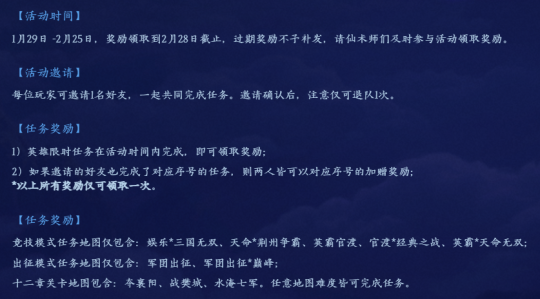 魂灯入梦,风华初现,新英雄张春华携“白嫖”礼登场! 1月29日起,完成活跃任务,璇玑福铃、橙色玩具包、竞技冠军封灵玉、紫仙玉、士兵卷轴全部带回家!快随梦梦去瞅瞅~ 活动时间 2026年1月29日-2026年2月25日 活动玩法 ●英雄见面礼:活动期间在页面查看新英雄全部技能,即可领取1份礼包。 ●魂灯换好礼:完成每日任务收集魂灯,积攒指定数量的魂灯,能领取对应奖励。 ●专属任务礼:完成新英雄专属任务获得好礼,组队与好友两人都完成任务,也可以获得额外奖励。 英雄见面礼 活动开启后,仙术师在页面查看新英雄全部WERF技能,可直接领取一份大礼包。 礼包内有藏龙紫仙玉*200、十万士兵卷轴*10、珍材自选宝箱*2、魂灯代币*5。 动动小手,认识下新英雄就能轻松获得来自她的见面礼啦! 魂灯换好礼 每日分享页面获得1份分享礼,内含活跃自选礼包、活跃宝葫芦和十万士兵卷轴。 活动期间,每日完成指定地图击杀或助攻任务、参与任意十二章地图,均可获得5个魂灯。 仙术师收集到指定的魂灯数量后,可解锁魂灯礼包。梦梦算了下,最快12天就能白嫖到全部奖励! 奖励包括璇玑福铃(可用于春节活动)、竞技冠军封灵玉自选礼包、藏龙紫仙玉、五行宠物精元/小鱼干自选、十万士兵卷轴、防具/武器/坐翅材料等。 竞技冠军封灵玉自选礼包(30天) 专属任务礼 活动期间完成英雄专属任务,如游戏签到、使用新英雄参与竞技/出征、新英雄击杀或助攻等,可领取征战印记、好感玉、紫仙玉、七宝珍材奖励。 全部完成最多可带走七宝/莲花自选*15、活跃礼包*6 等。 若邀请1位好友组队,且队友也完成了对应序号的英雄专属任务,双方都能领取额外奖励,如橙色玩具自选包、百炼封神石、神之防具打造书页等。 橙色玩具自选包 这可真是说白嫖,白嫖到,万事俱备只等更新,届时美美体验新英雄,顺手薅波羊毛,何乐而不为呀? [编辑:月光下完美]