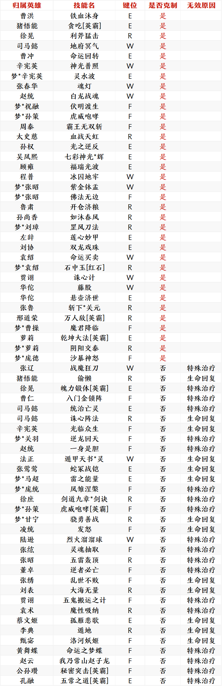 仙术师们好~新英雄张春华已然登场,诸位都讨教了没?其以伤换伤、克制治疗、丝血复活等技能特点,为战场带来了别样的风味。 梦梦按照惯例,请到策划详细拆解她的玩法思路(以2号位劣势路为例),并附上禁疗克制清单,帮助大家吃透新英雄,梦三横着走! [魂灯]:召唤魂灯造成范围伤害和减速,并持续吸取周围敌人生命值治疗自身。 [伤逝]:施放魂能造成范围伤害,并根据敌人损失生命值造成额外伤害。 [绝情]:对1个敌人造成持续伤害,根据其获得的治疗量造成伤害,并禁疗。 [滴血重生]:提升自身移动速度,并使技能附加额外伤害,受到致命伤害可复活。 壹 · 战斗思路/冥夜之主*张春华 定位为远程半肉法师的张春华,基础技能兼具远程袭扰和回复。 技能效果与推荐加点 一技能「魂灯」集范围伤害、减速、治疗为一体,是张春华的主要线上续航技能。 二技能「伤逝」造成远距离伤害,冷却时间短蓝耗低,是线上主要的消耗技能。 三技能「绝情」具有禁疗效果,能使部分英雄的治疗技能失效,具有极强的针对性。 大招「滴血重生」可以使技能附带百分比生命值的额外伤害,受到致命伤害时复活,是张春华最重要的输出增幅和生存依仗。 因而技能推荐加点:主一副二,有大点大。 英雄分路与对战思路 张春华推荐分路为2号位劣势路。 前期通过一技能和二技能清线,利用一技能治疗效果保持较高血量。 当对方人数多,对线压力大时,也可以退守劣势路野区,利用技能距离远范围大的特点清理野区,线野双收,保证自身发育。 团战前期应尽量利用施法距离优势,通过远距离技能消耗敌人。 中后期自身生命值和生存能力提升后,可以适当前压吸引敌人火力,压制敌人后排,借助大招的复活机制获得收益。 张春华的技能缺少稳定控制也不能治疗队友,不适合担任5号位辅助的角色。 如果走中单会面临技能爆发不足的问题,建议走劣势路出肉装,能更好保证前期发育速度和装备成型。 贰 · 出装天赋/?冥夜之主*张春华 作为远程半肉法师,张春华需要通过装备提升自身生存能力和输出环境。 出装推荐 「极冻*霸龙枪」优质的生存属性和技能附加减速效果,与张春华的技能具有极高的适配性。 一技能不可移动,伤害范围固定,利用极冻*霸龙枪叠加减速效果后,能更好地限制敌人机动性,增幅技能输出。 「治疗*麒麟血魄」提升生存属性和技能伤害,主动效果可以治疗队友,增强团战辅助能力。 大招增幅技能伤害依据的是自身当前的生命值,提升生命值和及时治疗都是增幅大招伤害的有效手段,治疗*麒麟血魄可以满足张春华对生存输出的需求。 「抗魔*玄玉披肩」提升法术抗性,降低冷却时间,适配二技能短技能冷却的特点,大招期间施放技能消耗自身生命值也可以被抗魔*赋魔披肩降低。 「闪耀之石」则能有效弥补张春华机动性不足的短板,且在大招触发复活后快速跳走,是必备的保命技巧。 许愿天赋 开局许愿选择“身经百战!”,大大提高张春华对线期的生存及续航能力。 英雄的天赋选择上: 10级“+50伤逝伤害”,弥补张春华的输出不足,提升的伤害量刚好能使一二技能连招清除兵线。 15级“+20%法术抗性”和“+275生命值”都可以选取,法术抗性能减少大招期间自身的生命值消耗,与抗魔*玄玉披肩叠加后64%的法术抗性,能有效降低敌方法师对张春华的伤害。 20级“+15护甲”,作为一个智力型英雄,张春华的基础护甲值较低,在面对敌方后期物理输出时,+15护甲能减少英雄受到的物理伤害。 25级“+50生命回复”,有效提升自身生存续航能力,若打法比较激进,也可以选择“+30%技能吸血”。 叁 · 禁疗克制/?冥夜之主*张春华 考虑到英雄平衡性,仙术师体验张春华后会发现,三技能「绝情」?的禁疗和治疗转伤害效果,不是对所有治疗效果和吸血效果生效的。 哪些技能生效?哪些技能不生效?下面对禁疗效果的克制规则进行了汇总—— 1:治疗类技能会被克制。 2:生命回复类不被克制。 (即不会禁止基础生命回复,通过增加基础生命回复生效的治疗技能不会被克制) 3:普通攻击吸血类技能会被克制。 4:造成伤害和同时触发治疗的技能不会被克制。 (属于特殊的治疗类型,不被视作治疗和吸血) 道具类克制效果 技能类克制效果 立春玩张春华,保管春风得意笑哈哈!仙术师们觉得新英雄的手感和强度如何? [编辑:月光下完美]