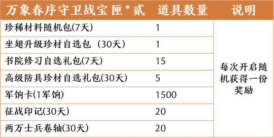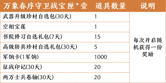 立春已过,万象更迭,春宴版本也在赶来的路上啦~这不,刚出炉的版本情报双手奉上——全新春日主题地图『万象春序守卫战』,咱们先睹为快~ 『万象春序守卫战』设计 春序轮回,本是万象待新,却忽有黑云压境,天地失和!适逢冠军之师凯旋,英雄疾赴司天监,欲借五色神石,研彩入墨,聚纳春灵,重绘万象春序。 画卷方成半幅,骤然罡风裂云、惊雷撼岳,山河灵魄化形而起。仙术师,还请速速执刃,守此天地! 本次春宴地图在设计上,充分呼应了“春序轮回,万象待新”的春日主题。仙术师们将亲临一座春色环绕的岛屿,青山叠翠,绿柳垂丝,满图春意盎然,有着别具一格的视觉体验! 为提高游玩时的新鲜感,地图新设计了造塔防守内容:仙术师需巧妙布置机关,激活特殊能力以抵御敌军。 同时,通过拾取地图中掉落的强化石,提升装备属性,可由“势单力薄”成长为“所向披靡”。个人实力强弱,取决于在玩法中的策略和发育。 『万象春序守卫战』奖励 人数:1-5人(每日最多挑战5次) 时间:开启后每日06:00-23:00 条件:守住3波妖魔进攻即可胜利 地图分为9个波次,前3波难度较低,适合全民参与。波次越高难度也会越高。 仙术师参与并守住3波妖魔进攻,即可胜利获得基础通关奖励。打通更高波次还能领取差额奖励。 通关奖励包括高级防具珍材、士兵材料成长包、万象春序守卫战宝匣等。 万象春序守卫战宝匣*壹 万象春序守卫战宝匣*贰 万象春序守卫战宝匣*叁 『万象春序守卫战』玩法 仙术师需要合理运用新加入的塔防玩法,布置防御设施防守敌军,并通过掉落的强化石强化装备,提高自身能力。 核心机制 地图成长空间巨大,仙术师可在开局购买基础装备,逐步进阶至五彩装备。 要注意啦,地图怪物有的适合前期打,有的适合后期打。低神兵可按照由弱至强的顺序,高神兵则可快速挑战高难度怪物,赢得更大的发育空间。 肉装道具升级 为了照顾肉套体验,本地图特意升级了肉装输出道具,肉套仙术师能使用下列装备获得更佳的实战感受。 造塔防守玩法 每局战斗中,通过击败进攻小怪能获得各种防御设施,将其摆到特定位置,可利用其阻挡敌军。不同防御设施会发挥不一样的作用,如:能偷取敌方金币的弓手;造成范围伤害的术士;还有造成大量伤害的稀有激光塔和巨型投石塔。 装备强化模块 地图上还可以获取强化石,用于提升装备等级,装备的属性会获得额外加成。 装备最高可提升到8级,当多个装备满足强化等级后,可以激活强化共鸣,解锁更强能力! 多彩成品直接掉落 梦梦悄悄透露给大家,地图基地左方的隐秘小道与右方空地,会不定时刷新封印宝箱和多宝福猪,将其击碎能获得多彩顶级装备,直接一步毕业! 『万象春序守卫战』将于近期上线测试区,仙术师们可前往抢先体验!随梦梦一起守护这方春日天地,顺手薅福利吧~ [编辑:月光下完美]