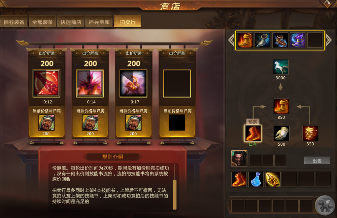 吃鸡党集合,梦梦接着爆猛料~春宴版本不仅能畅玩专属地图,天命*荆州争霸也将迎来重大更新—— 涉及技能书拍卖新玩法、技能随机概率优化、地形重构野怪优化等……可谓是直击痛点、体验翻倍!快随梦梦往下看~ 技能书拍卖 技能书迎来新玩法,闲置的技能书可以上吃鸡回收啦!春宴版本的吃鸡商店会增加拍卖行专区,仙术师能在此上架和竞拍技能书。 拍卖行将于8分钟时开启,届时可打开任意S级或X级技能书,通过“拍卖”按钮将其上架至拍卖行,其他仙术师(除队友外)都能点击技能图标出价竞拍。 每本技能书的起拍价为商店原价(小技能200,大招400),后续每次出价累加商店原价,拿大招举例,每次出价按400/800/1200以此类推。 每本技能书有20秒的竞拍时间,时间结束成交或流拍,流拍后技能书将按商店原价由系统回收并返还金钱。更多详细规则可待玩法更新后,在大商店的拍卖行规则介绍处查看。 为便于仙术师查看当前拍卖的技能书,游戏界面右侧的快捷购买技能书按钮也同步增加了拍卖功能:可快速在购买和拍卖技能书之间切换,实时查看并参与竞拍。 快捷购买技能书 快捷拍卖技能书 天赋许愿/天命职业合并 新版本中,天赋许愿与天命职业可以一并选择,避免重复打开界面,增加了操作便捷性与流畅性,进一步提升战斗体验。 技能随机概率优化 开局随机技能时,将依据英雄的物法肉模板,大幅提高对应技能的出现概率。 后续8分钟购买技能书时,也将依据仙术师们的天赋许愿选择,提高对应物法肉类型的技能随机概率。 也就是说版本更新后,开局和购买时都有更大概率随机出适合自己的技能,后期越容易成型! 地形与野怪优化 老地形进行了局部的地形重构,扩大实际面积,并在新区域增加战鬼吕布BOSS,掉落物为大量复制卷轴和四象仙丹。 同时,所有地形都将在8分钟后概率刷新掉落古鉴珍藏的摸金掉宝怪,提高产出高等级摸金收藏品的概率。 [编辑:月光下完美]