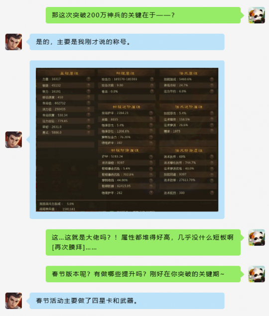 临近年关,报喜送福咯~回望1月29日,不仅是春节版本上线的日子,更是梦三大陆里程碑式的重要节点:榜单大佬们相继突破200万神兵,步入新征程。 那么仙术师就要问了,200万神兵是什么概念?需要用时多久?突破的关键在哪儿? 梦梦有幸邀请到荆州大区神兵超200万、全服物理榜榜首——“不打游戏的三笠啊”,分享他的心得体会~ 突破200万神兵,对仙术师而言是实力和荣耀的象征,是十数年热血与激情的印记。对梦三国而言,更是养成体系、内容深度和长线生命力的验证。 未来,梦三项目组会持续推动体验优化、功能迭代和玩法创新,伴随仙术师们共同成长! [编辑:月光下完美]