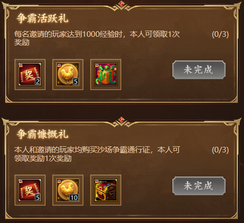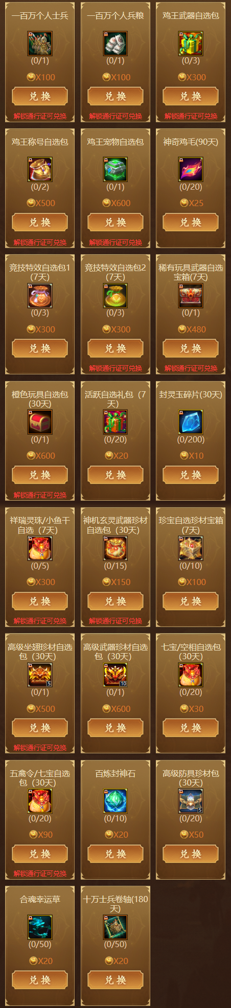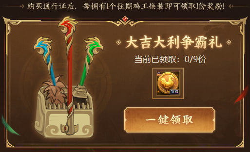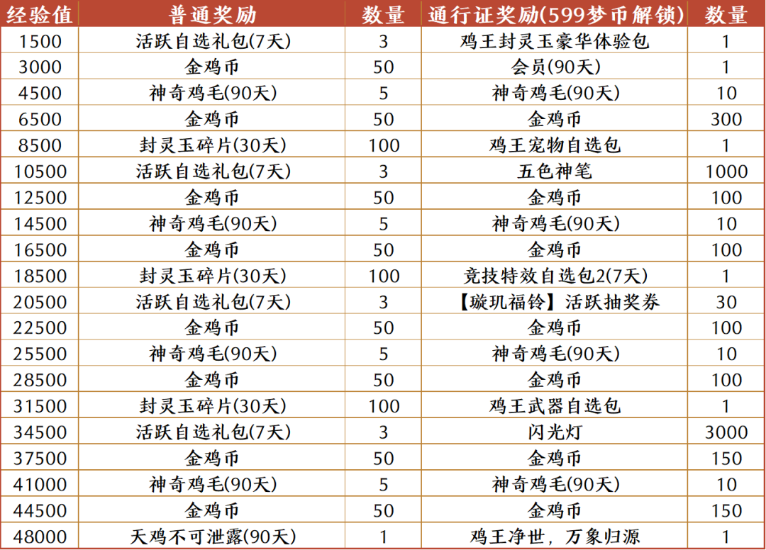 全新鸡王重磅出炉,梦三“环保大师”蒲元闪亮登场! 为表祝贺,历届鸡王齐聚一堂,还备下春宴代币、最新章节武器材料、璇玑福铃奖券、百万士兵等丰厚好礼,邀仙术师们同享同乐~ 活动时间 3月5日-4月1日,共4周;兑换和礼包购买时间延长至4月3日。 活动玩法 ●仙术师参与娱乐*三国无双/天命*荆州争霸/英霸官渡/英霸*天命无双/军团出征/军团出征*巅峰,每获得1点军威值对应1点经验,天命*荆州争霸额外可得20%经验值。 ●累计经验值免费领取普通奖励,消耗599梦三币开放争霸通行证奖励。此次无每周经验上限,达到对应经验值即可领取奖励。●?本届鸡王活动新增个人经验值排行榜(经验值无上限),活动结束后依据排名发放奖励。 ●经验值奖励中的金鸡币,可用于商店兑换道具,邀请好友等也能获得金鸡币和奖励,活动结束金鸡币将清空。 鸡 王 奖 励 问鼎沙场,狂领好礼!3月5日起,仙术师参与吃鸡、娱乐、英霸、出征等均可累计经验值,获得相应奖励。 经验值奖励分为普通奖励与通行证奖励(消耗599梦三币解锁),包括鸡王换装体验包、金鸡币、五色神笔(春宴活动代币,可用于抽奖)、专属称号、福铃奖券、闪光灯、神奇鸡毛等。 累计1500经验值并解锁通行证,可领鸡王封灵玉豪华体验包,获得蒲元*环保大师和往届所有鸡王的180天换装! 解锁通行证后,还能带走30张福铃奖券、1000五色神笔、3000闪光灯、鸡王宠物/武器等超值道具! 鸡王封灵玉豪华体验包 蒲元*环保大师:戳图片查看换装技能 鸡王宠物自选包(7天) 竞技特效自选包2(7天) 鸡王武器自选包(7天) 所有经验值奖励中,共计可得神奇鸡毛*60,集齐100鸡毛能合成新的神乎其鸡自选包(增加酆都*阴阳净土/千秋*九龙双刃等玩具),或妖星冰握、太极阴阳剑。 回 馈 福 利 新王登基,福利拉满!蒲元携专属好礼,前来犒劳各位仙术师—— 解锁通行证后,仙术师每拥有1个往期鸡王换装,可领取100金鸡币,最多领9次。金鸡币能用于争霸商店兑换心仪道具~ 此外,消耗2399梦三币购买特惠包(限购9次),可自选1件往届鸡王系列换装礼包。 无敌鸡王冲锋包(7天) 天命之子必胜包(7天) 天命公主出巡包(7天) 天命圣女守卫包(7天) 枪王之王征战包(7天) 天命大帝赐福包(7天) 疯狂鸡娃献瑞包(7天) 暗藏沙鸡锦猴包(7天) 鸡肉猛男壮怀包(7天) 邀 请 有 礼 携手同行,福利加码。活动期间,仙术师每邀请1位好友进行绑定,可得金鸡币、活跃包、小士兵卡,最多领3次。 每位邀请的好友累计1000经验时,可额外领取金鸡币、福铃奖券、畅玩包。若仙术师个人与绑定好友均解锁了通行证,还能再领金鸡币、福铃奖券、超炫玩具包。 超炫酷玩具自选包(7天):限时7天 商 店 兑 换 金鸡报喜,超值选兑。 本期积攒的金鸡币,能在争霸商店兑换神机玄灵武器珍材、百万士兵/兵粮、鸡王武器/宠物/称号、神奇鸡毛、祥瑞灵珠、百炼封神石等,部分需满足通行证条件。 梦梦算过啦,经验值奖励、回馈福利、邀请有礼中,最多可拿1400/900/60金鸡币。 戳图片查看完整兑换道具 稀有玩具武器自选宝箱(7天) 神机玄灵武器珍材自选包(30天) 争 霸 排 名 鸡王争霸,勇攀高峰!本次新增了争霸排行榜,活动结束后经验值前120名的仙术师可获得丰厚奖励。 奖励包括百万士兵/兵粮、绑定梦三币与“神鸡妙算”动态图片称号,最高可得10000梦币! 鸡王盛典将随春宴版本同步来袭,配合天命*荆州争霸改版优化,相信仙术师们定能收获满满~ [编辑:叶子猪小秘书]