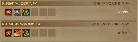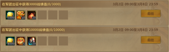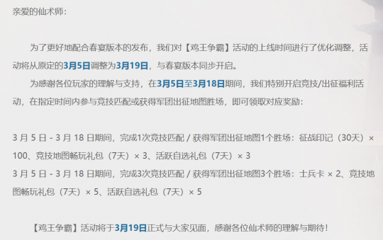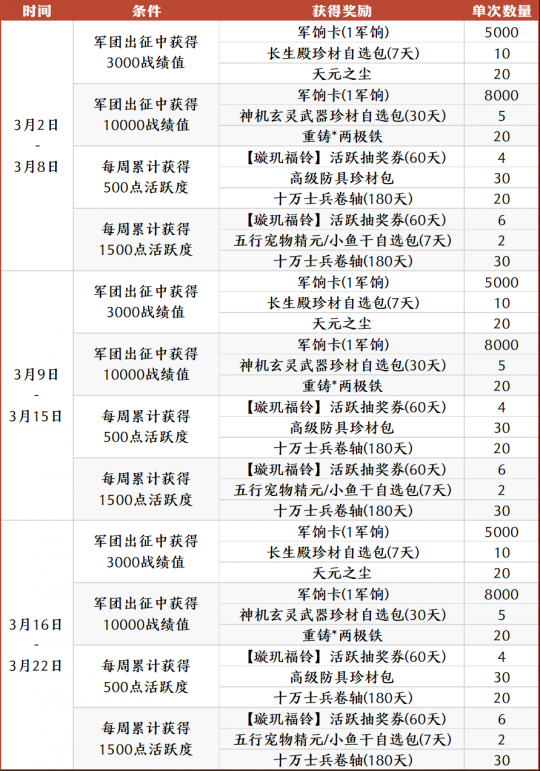 仙术师们好呀~元宵活动已正式开启,现可解锁张春华×司马懿换装、宝匣珍材等好礼。 同时,梦梦还有惊喜福利加码——3.9万军饷、30张福铃抽奖券、15份神机玄灵材料、千万士兵卷轴……统统活跃免费得!诸位往下看~ 周活跃 3月2日-3月8日、3月9日-3月15日、3月16日-3月22日期间,每周达成出征战绩值任务(仅限军团出征地图,不含巅峰场)和活跃度任务,均可领取丰厚奖励。 每周战绩值/活跃度的任务和奖励相同,共计可得3.9W军饷、30份五禽令自选、15份神机玄灵包、30张福铃奖券、6份小鱼干自选、1500W士兵卷轴等。 每周活跃任务奖励:持续三周 长生殿珍材自选包(7天) 神机玄灵武器珍材自选包(30天) 高级防具珍材包 五行宠物精元/小鱼干自选包(7天) 都是顺手的事儿,3月的第二波福利仙术师们千万别错过! 此外,为配合春宴版本内容发布,鸡王活动开启时间将调整为3月19日。且仙术师在3/5-3/18期间,完成竞技或出征匹配胜场,也可获得士兵、畅玩包等奖励~ [编辑:月光下完美]